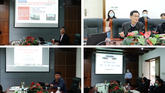 校发展规划处处长李忠明教授向大家介绍学校贯彻落实“文优、理进、工改、医强”的学科建设理念、深入推进学科内涵发展建设、第五轮学科评估以及双一流验收等情况,并对学院学科发展建设提出了建议。党委书记牟德富从国内社会评价、综合评估、人才、科研等方面对学校高分子学科现状进行了分析介绍。科研副院长杨伟介绍了学院近五年科研数据、学院在全校科研排名及国家科研相关新政等内容。青年教师代表李乙文、王宇分别做了题为“高分子材料研究的进展介绍与思考”和“关于高分子加工‘危’与‘机’的个人思考”的报告,介绍了国内外高分子材料方向最新工作进展、分析了当前形势,并对学院发展建设给出相关建议。