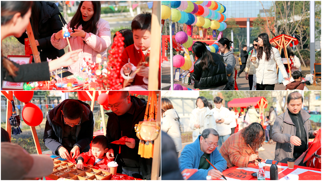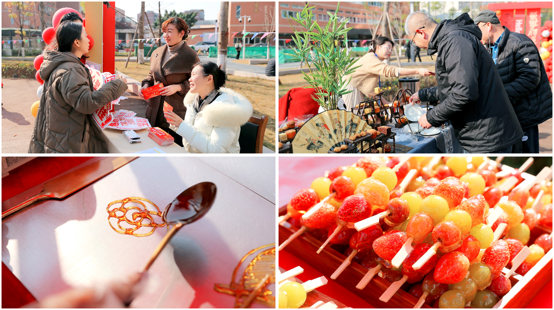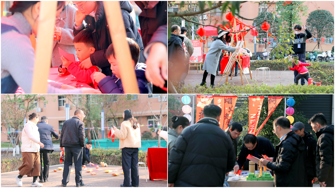 下午两点三十分活动正式拉开帷幕,活动现场被彩灯与彩带精心装点,节日氛围浓郁。教职工在轻松愉悦的氛围里,共同参与丰富多彩的摊位活动。这些摊位不仅汇集了各式游戏和美食,更展示了中国传统文化的精髓。从“纸韵生花”到“晶糖串趣”,从“面塑传神”再到“糖绘缤纷”,以及充满挑战的“灯谜雅趣”,传统技艺与现代创意交相辉映,每一处都洋溢着新年的喜悦氛围。
