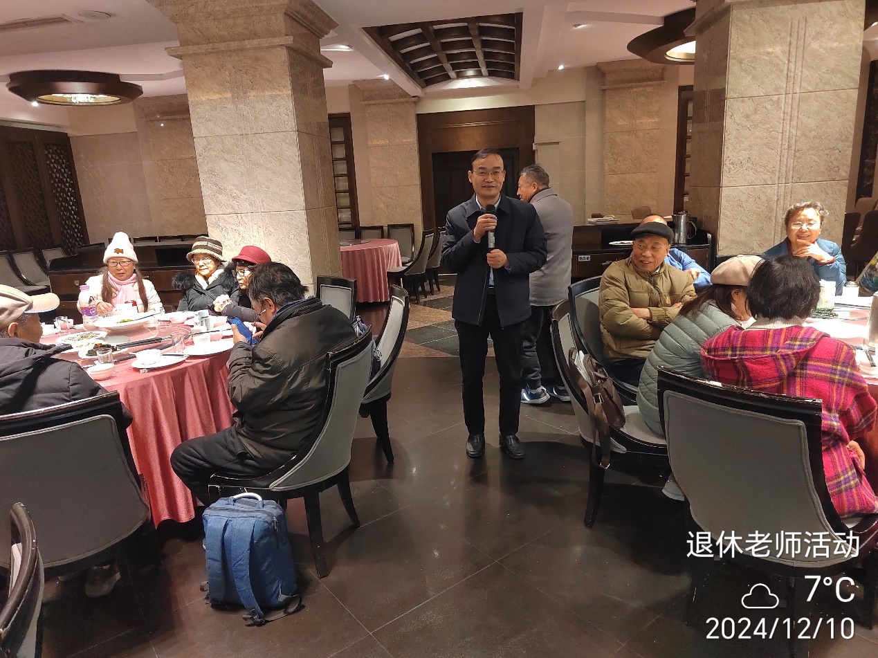 学院党委书记牟德富、副院长李艳梅参加了退休活动。牟德富书记向退休教师们传达了习近平总书记在党的二十届三中全会和全国教育大会重要讲话精神,介绍了学院2024年来在人才培养、教学、科研、学科方面的改革发展所取得的成绩和下一步的发展规划等,充分倾听老同志们的心声和意见。牟德富书记指出离退休教师是学院学科发展的亲历者、见证者和践行者,把青春奉献给党的教育事业,影响了一代又一代的高材人。元旦新年将至,他代表学院党政班子感谢退休教师们数十年来躬耕教坛、踔厉奋发,为学院建设发展做出的贡献,对老师们致以最亲切问候,衷心祝愿老师们岁岁平安、日日安康!