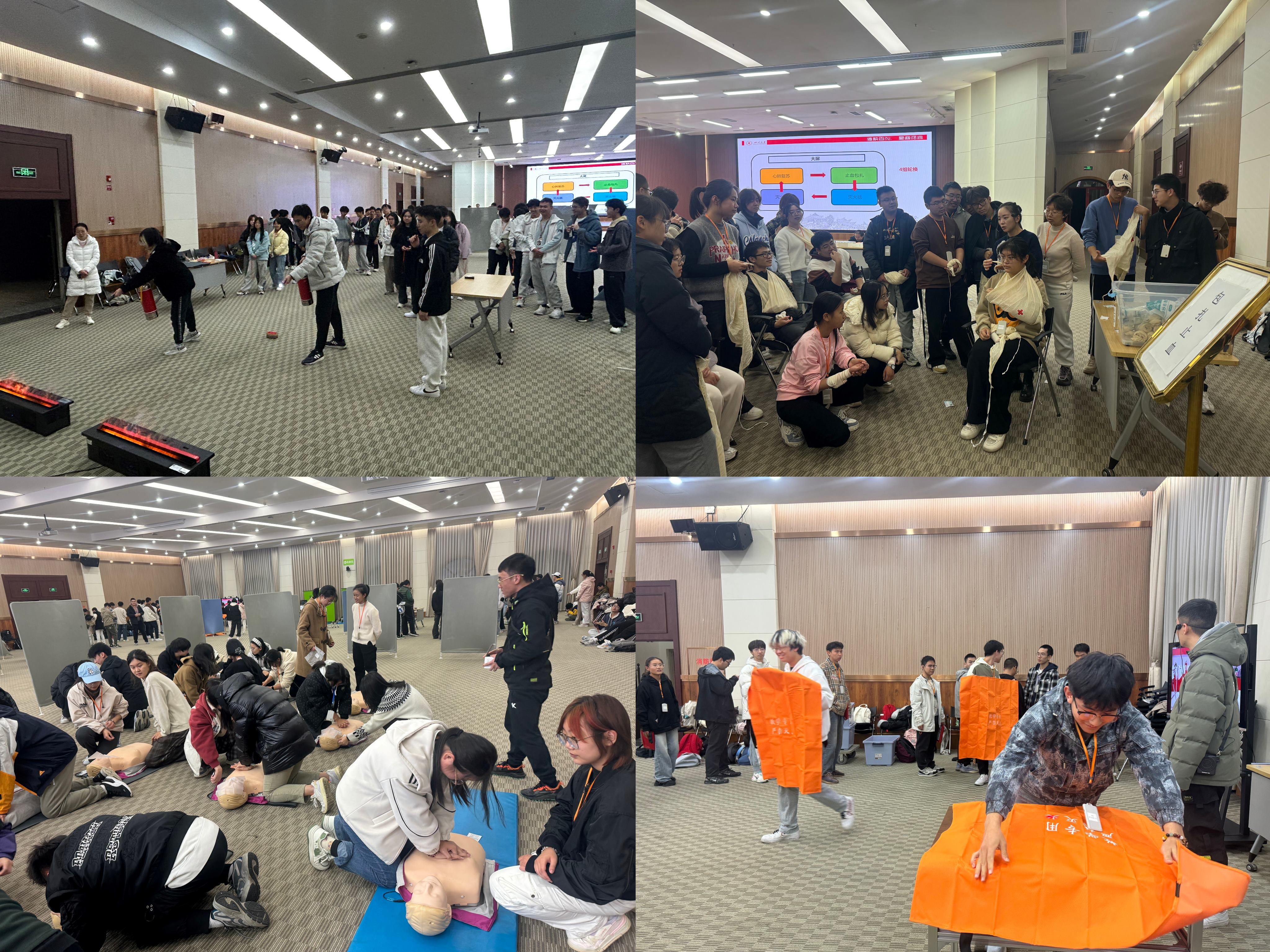 课程精心设计为四个实操环节:心肺复苏术、止血包扎、灭火毯以及灭火器实操,各环节同时展开,学生们分组轮换,以广覆盖性、强机动性、高组织性有序协调大规模课程场景。