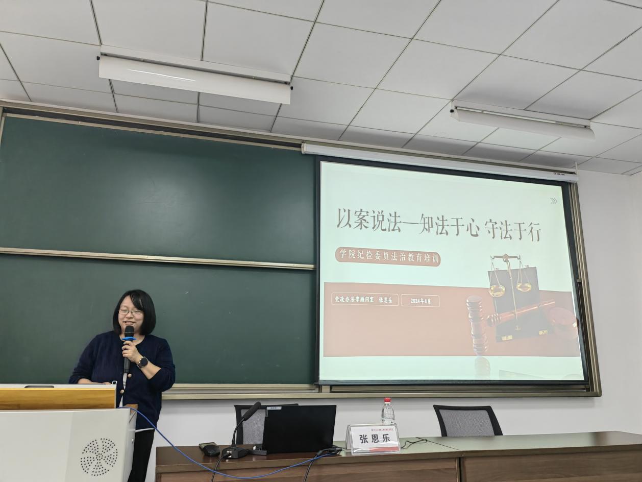 校法律顾问室主任张恩乐以《以案说法——知法于心,守法于行》为题,剖析了违纪失范典型案例,并结合新修订的《事业单位工作人员处分规定》等文件精神,对学校教师教学科研活动、行政管理和日常生活中常见的涉法风险问题进行了详细解读。