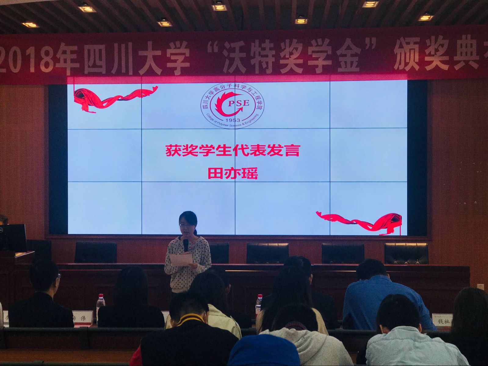随后,田亦瑶同学代表获奖学生发言。她感谢深圳市沃特新材料股份有限公司对川大学子的鼓励和支持,感谢学校和学院老师的辛勤培养,并表示高材学子们应该珍惜目前优越的学习和科研条件,在漫长而艰辛的探索中能寻到自己的真知灼见,仰望星光、脚踏实地,在学校这样一个轻松、包容、和睦的环境下,不骄不躁,认真对待学习,不轻言放弃,踏实勤奋,取得更优异的成绩,创造更美好的未来,力求将来成为社会中的栋梁之材。