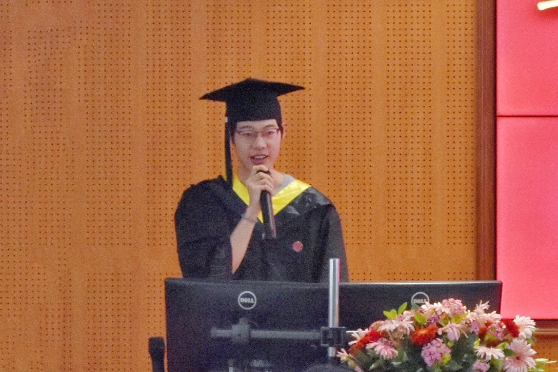 四川省优秀毕业生、2022届毕业生代表陈鹏同学代表全体毕业生发言。他细数大学生活中的点点滴滴,回顾了四年来的成长与收获,表达了对学院、同窗的感激之情。他表示将在新的征途,志存高远,砥砺前行,不负川大、学院的培养。