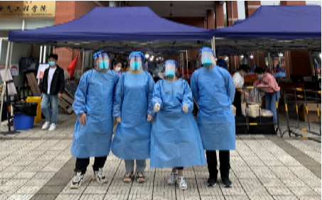 在校外,教师党员冲锋在前,积极参与到抗疫一线。很多老师主动加入小区志愿者服务队,承担核酸检测录入信息、秩序维护、物资分发、贴条码、装样品管等工作。