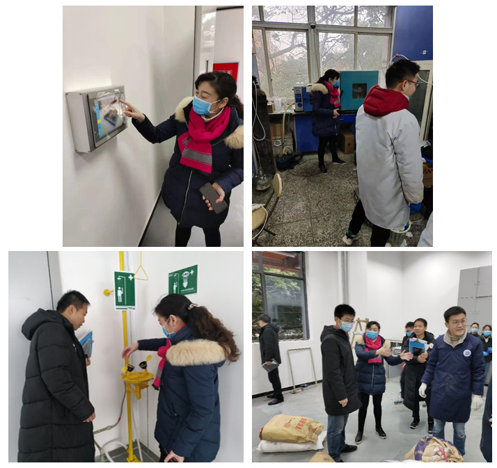 (3)12月31日上午9点,高分子学院安保工作小组在主楼205会议室召开12月份安全工作会议(图1)。会议由高分子学院主管安全负责人李艳梅副院长主持,高分子材料系安全员刘习奎、高分子材料加工工程系安全员包睿莹、学院安全秘书张明华和安全协查队员孙辉等参加了会议。会议结束后,安保工作小组一起对即将交付使用的科教楼进行检查(图2),重点查看了洗眼器、通风系统、灭火器等安保设施是否完备,试运行状况等;然后安保工作小组分两组对学院主副楼和西四教开展检查工作,确保实验室平稳运行。