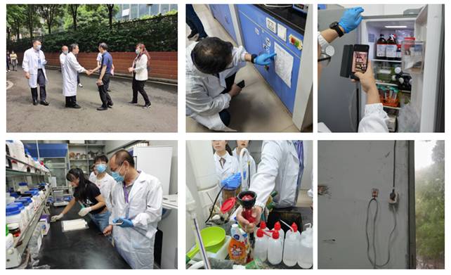 (3)5月19日15点,在设备处处长敖天其等领导的陪同下,五位教育部科研实验室安全检查专家和一位观察员检查了西四教316B和320两间实验室,牟德富书记、傅强院长、李艳梅副院长、生医系书记谢兴益、安全秘书张明华、316B实验室安全责任人丁春梅、320实验室安全责任人罗祥林等一同接待了此次检查(附件2)。专家指出,316B实验室存在以下几个问题:①洗眼器水压太低;②冰箱内存在易挥发试剂;③液氮罐挡住了实验通道;④压力锅无自动泄压装置;⑤空调插座不能转接,且需要采用空调专用插座;320实验室存在以下几个问题:①旋转蒸发仪卡子老化,无法起到固定作用;②未安装洗眼器③硝酸盐等易制爆试剂未放入试剂柜,应有专人管理。
