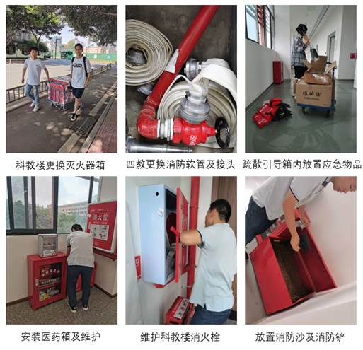 (2)6月1-7日,对学院的消防设施进行了安装及维护(附件2),学院新楼(科教楼)更换了部分损坏的灭火器箱,消防沙箱内放置了消防铲和消防沙,安装了疏散引导箱和医药箱,同时放置了相应的应急处置物品;西四教更换了消防软管及接头。