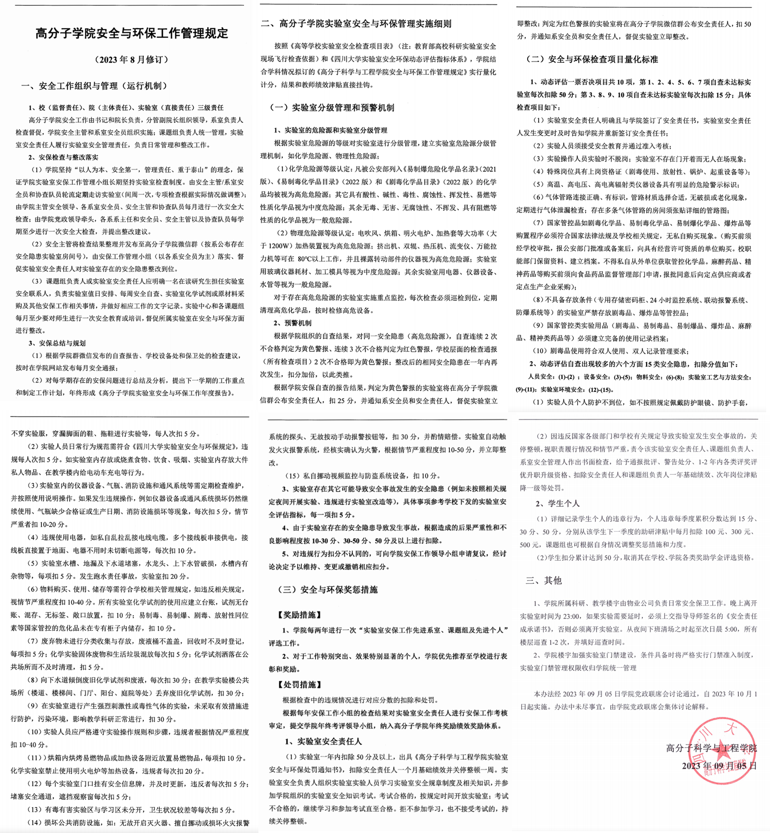 (3)9月5日,为落实校(监督责任)、院(主体责任)、实验室(直接责任)三级管理及责任体制,学院审定通过《高分子学院安全与环保工作管理规定(2023年8月修订)》(附件1)。