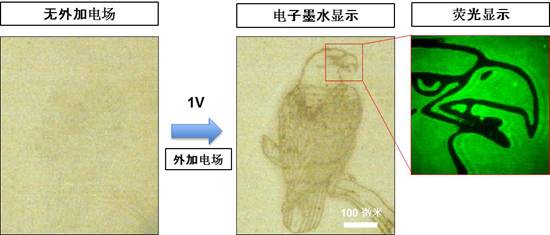 该团队设计的阅读器主体是一个由两块导电玻璃构成的微米级薄层腔室,新型电子墨水材料(即人造黑色素纳米粒子水溶液)分散在其中。由于黑色素纳米粒子表面带有负电荷,可以通过外加电场来控制它们的运动,从而进行显示成像(图1)。该团队在研究中发现,当两块玻璃距离在100um左右时,仅须1V电压即可驱动该阅读器实现字符和图形的快速显示,显示时间小于1S。切换反向电场,同样可在1s内完成字符/图形的擦除。在经过20个以上的“显示-擦出”循环实验之后,电子墨水的显示对比度和响应时间保持不变,显示了良好的实用化和较强的商业化可行性。实验中与基于目前商用化的电子墨水材料(如炭黑、二氧化钛颗粒)的阅读器进行对比,发现人造黑色素电子墨水材料显示的对比度均一性、以及信号/背景衬比度相对于商业化的电子墨水材料均具有一定的优势。最重要的是,由于实现了水相纳米粒子地直接驱动,显示器件的分辨率可以达到10000 PPI以上,可进行纳米级显示。此外,经过简单氧化处理后的人造黑色素粒子具有非常强的荧光,使得器件也同样具有特殊的荧光显示的功能,可以进一步提高阅读时候信号/背景的衬比度(图2)。
