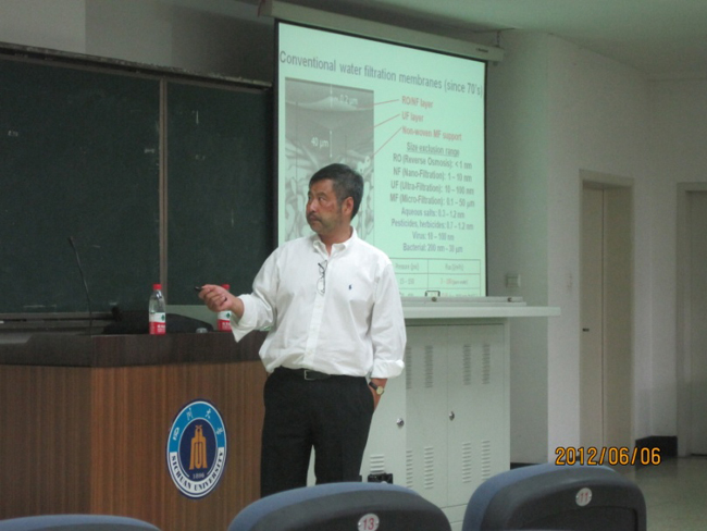 Benjamin S. Hsiao教授向广大师生介绍了可用于水净化处理纳米纤维薄膜的研究工作进展以及其未来的发展方向。他指出非 常有必要针对不同水杂质(比如细菌、病毒或重金属等)的特征来设计处膜的结构及孔径尺寸。通过对高分子物理及加工的深刻理解,Hsiao教授课题组将无纺布、静电纺丝高分子纳米纤维和纤维素纳米晶须依次设计为水处理薄膜的里-衬-外三层精细结构,以获得对不同直径杂质的隔离。外层的纤维素材料能赋予薄膜极大水流量,且衬层的孔径可以通过简单工艺条件调控,从而实现了对杂质从微米到纳米尺度的体积排除。