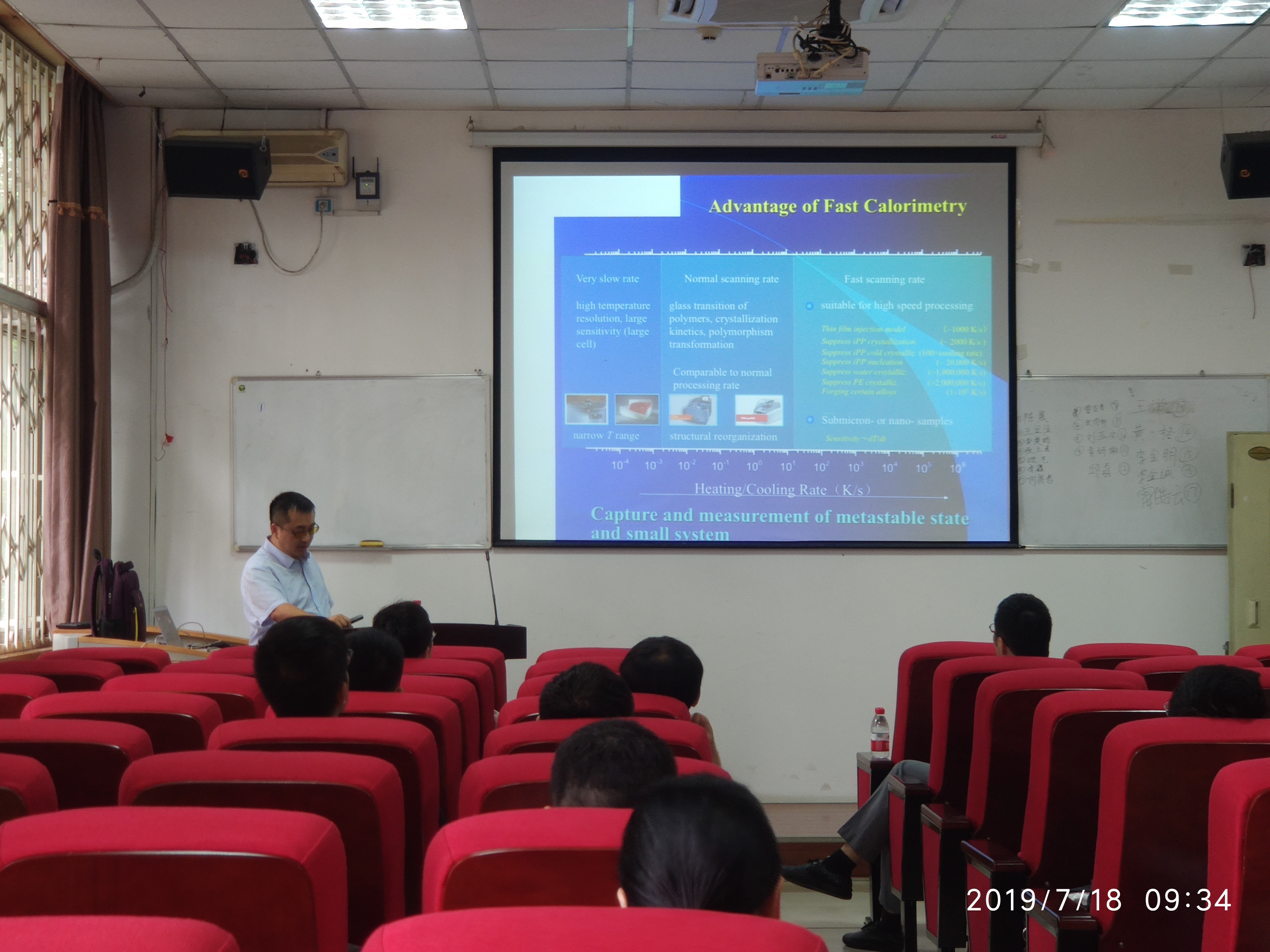 周东山教授从量热方法中不同升温速率应用范围出发,介绍了快速量热法的特点以及这一方法在聚合物表征方面的应用,重点讲述了该方法在受限态聚合物的表征、共轭高分子的结晶行为与玻璃化转变特性、聚合物体系的相分离等方面的独特优势。周东山教授同时介绍了这一测试技术对于柔性电子器件在设计优化等方面的指导作用。报告结束后,参会的师生与周东山教授进行了有关测试方法及设备设计方面的热烈讨论。通过交流,老师和同学们都受益匪浅,对这一领域有了更为深入的认识。