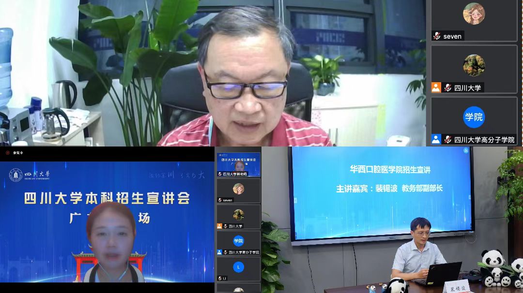 为增进我校与广东省高校的交流合作,吸引更多优质生源报考我校,5月11日,成人漫画 招生宣讲团举办广东省专场线上宣讲会,面向广东省的考生及家长开展线上校情及专业宣讲。本次宣讲由成人漫画 牵头组织,成人漫画 招生办公室主任张磊、成人漫画 院长赵长生、匹兹堡学院副院长麦诚志、生物医学工程学院副院长林江莉、华西口腔医学院副教授裴锡波联合主讲,成人漫画 副院长冉蓉主持会议。