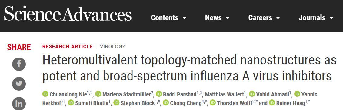 近日,成人漫画 程冲研究员团队联合德国柏林自由大学Rainer Haag教授等研究人员在高分子基病毒抑制剂领域取得的重要研究成果,相关研究已经在国际顶级期刊Science Advances在线发表(Heteromultivalent topology-matched nanostructures as potent and broad-spectrum influenza A virus inhibitors)。该合作团队报道了一种具有拓扑匹配结构的新型多价高分子纳米制剂,其可实现高效广谱的抑制流感病毒。相对于传统的抑制剂,该多价纳米制剂对病毒的抑制浓度可低至32.4±13.7 μg/mL,并可以减少99.99%的病毒传播。由于在新冠病毒也具有类似的结构,研究团队预期该研究结果将有助于新冠病毒高分子抑制剂的研发。论文的第一作者为成人漫画 优秀硕士毕业生聂川雄,现为柏林自由大学博士后。