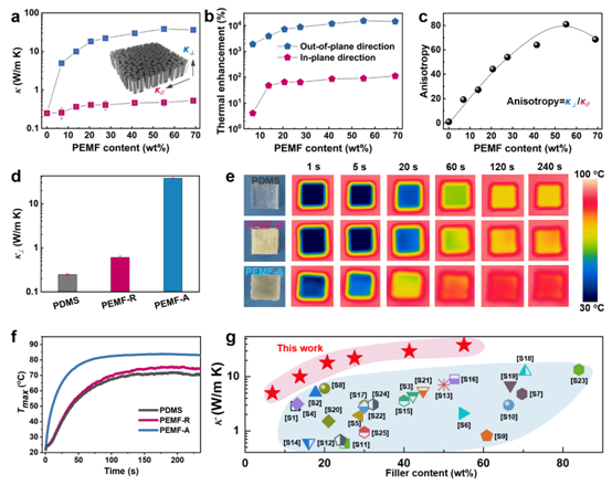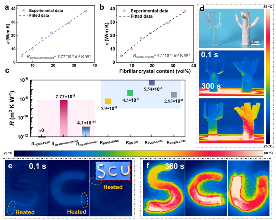 团队根据EMT线性模型和Foygel非线性模型分别拟合了PDMS/PEMF复合材料内部多相界面的热阻大小(图3),发现正是由于这种全程连续的PEMF导热通路,多相体系之间的界面热阻,包括PDMS-PEMF界面热阻(≈0m2 K W-1)、PEMF内晶区与非晶区的界面热阻(7.77*10-9m2 K W-1)、PEMF晶区间的界面热阻(4.1*10-11m2 K W-1)远远低于常规的聚合物/填料共混填充体系(10-6 – 10-9m2 K W-1)。