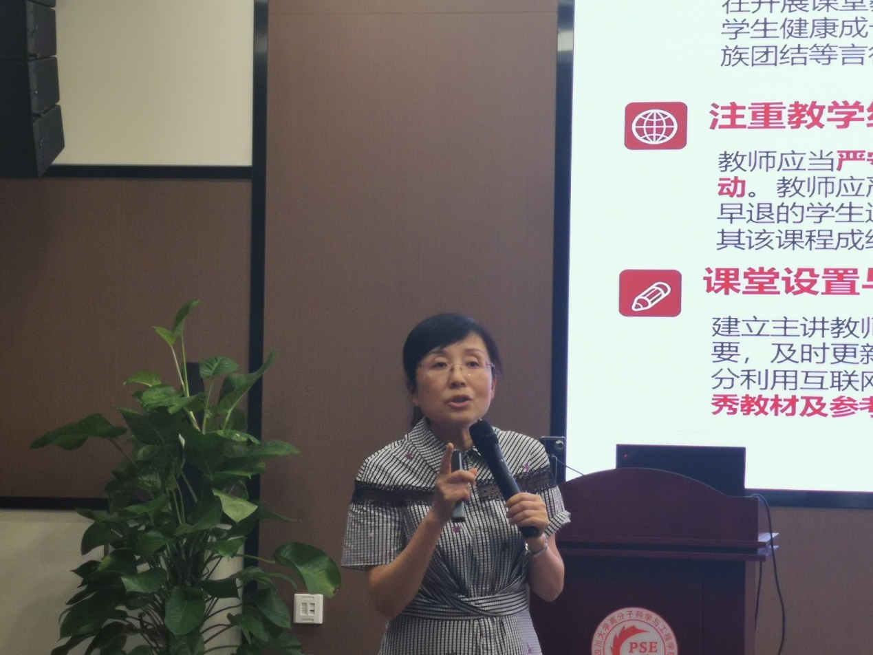 教务处冉桂琼副处长肯定了高分子学院教师在人才培养、学科竞赛、教学竞赛、教学“三大奖”等方面的贡献和成绩,并提出了三点希望:希望学院积极开展新工科建设和卓越工程师人才培养等方面的教育教学改革,争取有新的突破;希望学院教师将学科和科研优势转化为教育教学改革优势,积极参与建设高水平教材,提升国内外影响力;希望学院青年教师积极投身教育教学改革和教学竞赛,全面提升教学能力。