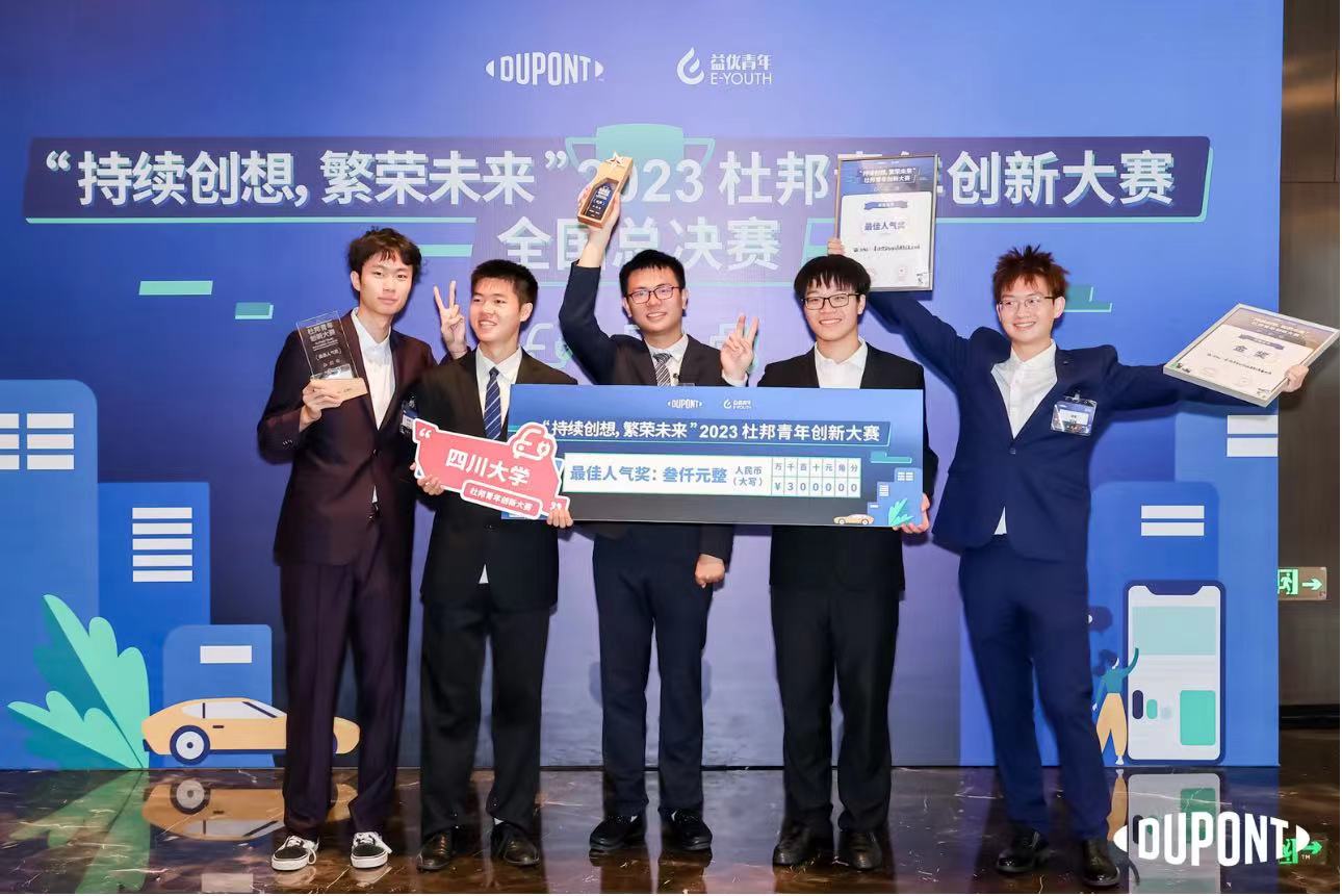 杜邦公司是以科研为基础的全球性企业,本次“持续创想,繁荣未来”青年创新大赛由杜邦中国公司发起,面向全国高校学生,以可持续发展为议题,经过6个月的预选初筛、项目展示和专家答辩等多个环节,包括川大“碳为观止”团队在内的六所高校团队进入全国六强总决赛。在决赛中,“碳为观止”团队凭借项目的创新性、技术的可实施性以及优秀的答辩展示,最终从六强项目中脱颖而出,夺得了全国总决赛冠军。