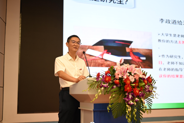 院长赵长生以“担时代重任,树高材新人”为题讲授 “开学第一课”,他寄语新生“奋斗所到处,青春恰自来”,鼓励同学们加入到建设世界一流高分子中心的伟大事业中来。肖明特聘研究员,本硕博贯通式培养博士研究生陈鹏,黄铄分别代表教师、学长和新生同学发言。