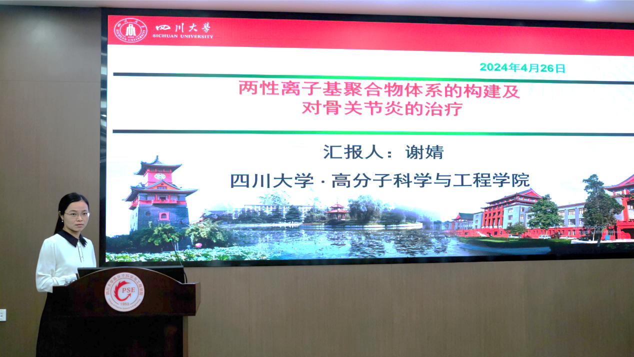医用高分子材料系青年教师谢婧作了题为“两性离子基聚合物体系的构建及对骨关节炎的治疗”的报告。报告指出骨关节炎(OA)是一种世界范围内致残的常见退行性疾病,也是导致老年人残疾和社会成本增加的主要原因。OA的临床早期症状为关节疼痛、僵硬和肿胀,到了中后期会影响关节运动过程,最终导致运动失衡甚至残疾。如何有效干涉骨关节炎,对延缓和抑制骨关节炎进程十分必要。针对该问题,报告人首先制备了环刷状两性离子聚合物,可实现长效润滑以及可控释放药物,并通过SD大鼠的骨关节炎模型证实材料体系有效治疗OA。进一步地,考虑到药物引入的副作用,报告人提出无药策略,制备具有良好润滑性、软骨靶向性以及抗酶解的类润滑素分子, 通过促进 II 型胶原的分泌与沉积,加速软骨修复。最后,报告人设计了一种新型光热纳米酶,通过同时模拟抗氧化酶和透明质酸合成酶活性,调节分解代谢与合成代谢实现OA治疗。该类方法有望为临床上的OA治疗提供一种思路。