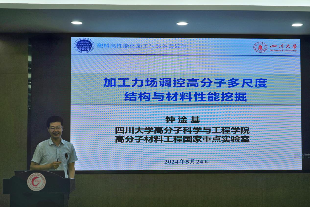 材料加工工程系青年教师钟淦基作了题为“加工立场诱导高分子多尺度结构与材料性能挖掘”的报告。报告主要讨论了施加加工力场是制造高性能和功能高分子材料的有效途径,其影响制品内部分子链的取向和松弛、结晶、晶体塑性变形、空化和相结构等微观多层次结构变化,并决定高分子制品最终的力学性能(高强度、高延展性)、阻隔性能(高阻氧、高阻水)、透明性和功能化(选择透过性、抗静电、储能)。目前拉伸力场加工已经实现高强纤维、单轴拉伸聚乙烯包装膜、双轴拉伸聚丙烯介电薄膜、双轴拉伸聚对苯二甲酸乙二醇酯(光学膜、航空有机玻璃等重要领域的工业生产。 然而,由于高分子加工力场下的微观结构演变受诸多加工条件影响,且存在多尺度结构演变,因而对其认识仍不全面;同时利用加工力场加工进一步挖掘高分子材料性能潜力,有望为高性能和功能高分子材料的工程实现提供可能。因此,报告介绍了在通用高分子以及生物可降解高分子中运用可控加工力场实现微纳米结构工程化和性能提升的近期研究工作,主要包括熔体拉伸力场下薄膜结构与性能、半固态拉伸力场下薄膜结构与性能、拉伸取向薄膜的功能化。