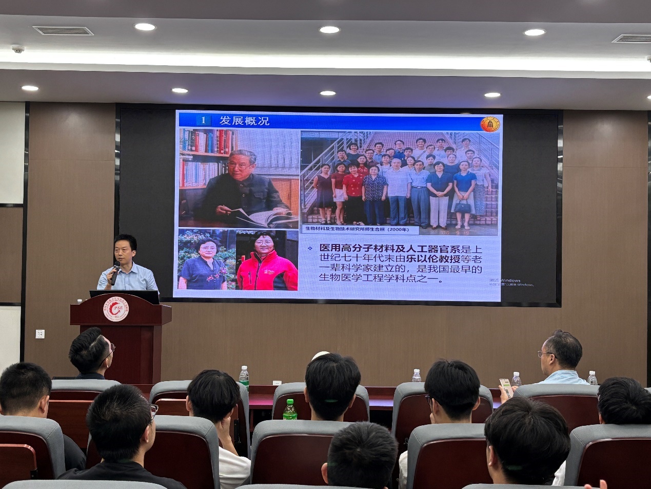 医用高分子材料系主任丁明明介绍医用高分子学科的发展概况及取得的成绩。他提到医用高分子材料系拥有一批在业内享有盛誉的科研工作者、杰出校友,他们为学科发展做出了重要贡献。他还鼓励新生要树立远大的理想与目标,积极向师长和学长学习,在提升专业能力的同时,注重综合素质培养。