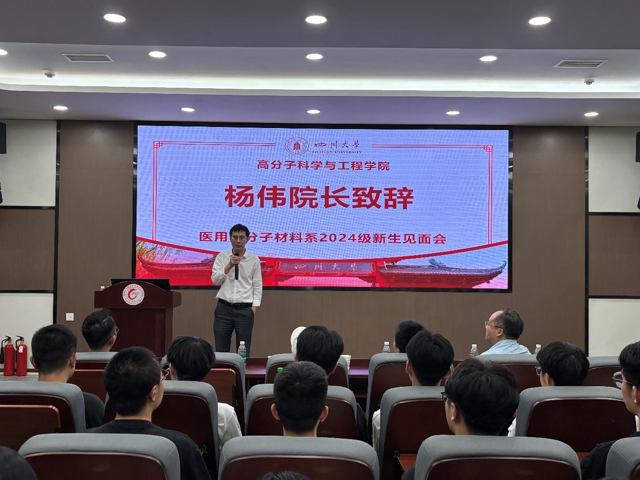 学院院长杨伟对新加入高分子大家庭的研究生们表示热烈欢迎,并回顾了医用高分子材料系的发展历程。他指出,学院的成长离不开历代师生的共同努力,学院将持续做好各项工作为师生营造良好的教研环境。他鼓励新生要积极融入校园生活,保持健康向上的生活态度,永攀科研高峰、锻炼实践能力,探索跨学科的交流与合作,成就自己的理想与抱负。