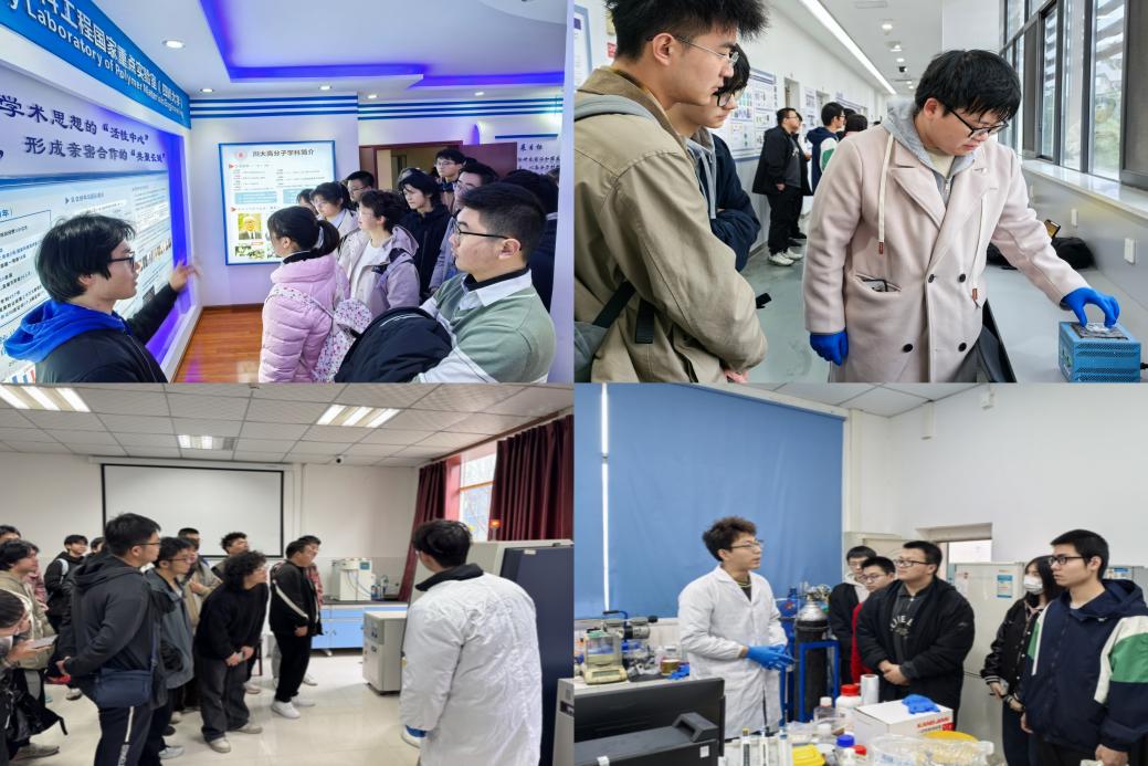 上午9时30分,全体学生在科教楼前集合合影后,分为十二个小组,在研究生志愿者的带领下,依次参观先进高分子材料全国重点实验室、科教楼、第四教学楼及工程训练中心等实验场所。各实验室老师及研究生学长学姐为同学们详细讲解了高分子材料的前沿研究方向、实验设备的功能与操作规范,并展示了近年来学院的标志性科研成果。面对先进的仪器设备和生动的实验案例,同学们表现出浓厚兴趣,纷纷结合课程规划与未来科研方向提出问题,志愿者逐一解答,现场互动氛围热烈。下午的自由参观环节中,学生根据个人兴趣选择课题组深入交流,近距离观摩实验流程。