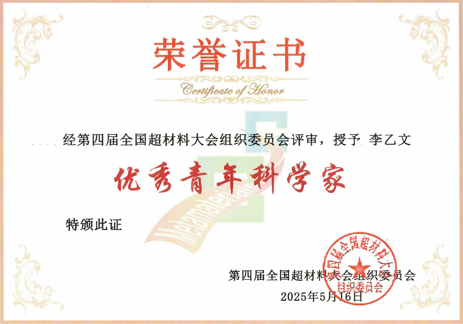 5月16日,第四届全国超材料大会在广东深圳开幕。大会以“锚定颠覆性技术、锻造新质生产力”为主题,吸引了来自全国高校、院所和领军企业的近3000名科技工作者围绕超材料最新动态展开研讨。本次大会经过严格遴选,评选出7位优秀青年科学家,在开幕式上由大会主席中国科学院院士崔铁军教授、中国工程院院士周济教授共同为他们颁奖,成人漫画 李乙文教授荣获该荣誉,他也是我国西部地区的首位获奖者。