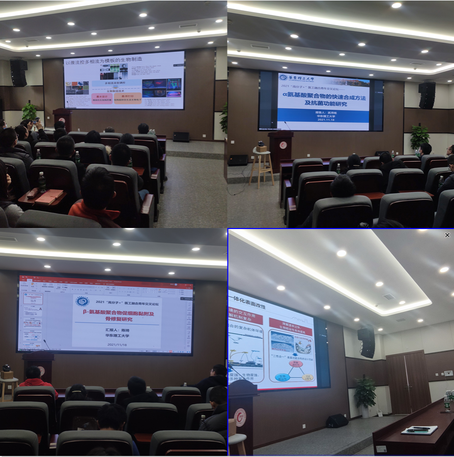 报告分享环节,深圳大学孔湉湉副教授进行了题为《微流控生物制造》的报告分享,介绍了其近期的研究领域与学术成果,其可实现高精度的微流控打印技术引起了在座青年学者的关注和讨论。上海交通大学裴佳副研究员、西南交通大学陈星羽副研究员分别进行了题为《可降解金属基医用材料现状挑战及其表面改性策略研究进展及思考》和《生物膜衍生的医用高分子材料》的报告分享,其在医用高分子材料的结构设计和功能修饰为在场青年学者提供了新的思路和策略选择。华东理工大学武月铭、陈琦老师针对其所研究的聚氨基酸领域分别进行了题为《α-氨基酸聚合物的快速合成方法及抗菌功能研究》和《β-氨基酸聚合物促细胞黏附及骨修复研究》的精彩分享,从机理方法、功能设计到模型研究都给在场从事相关研究的青年教师带来了启发,青年学者们也针对聚氨基酸的构效关系展开了热烈讨论。