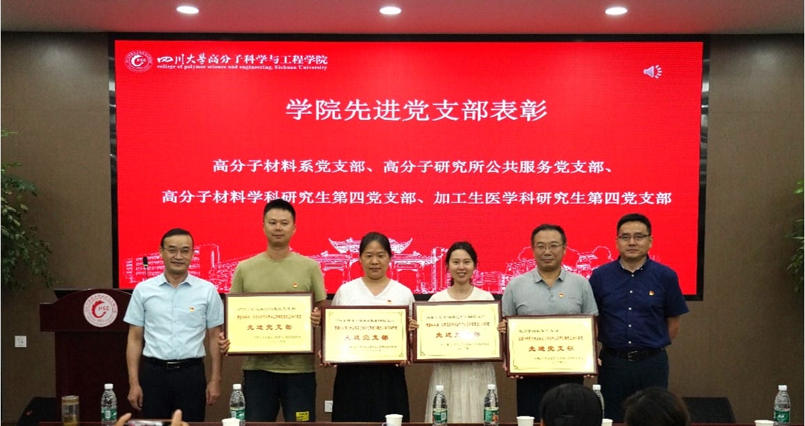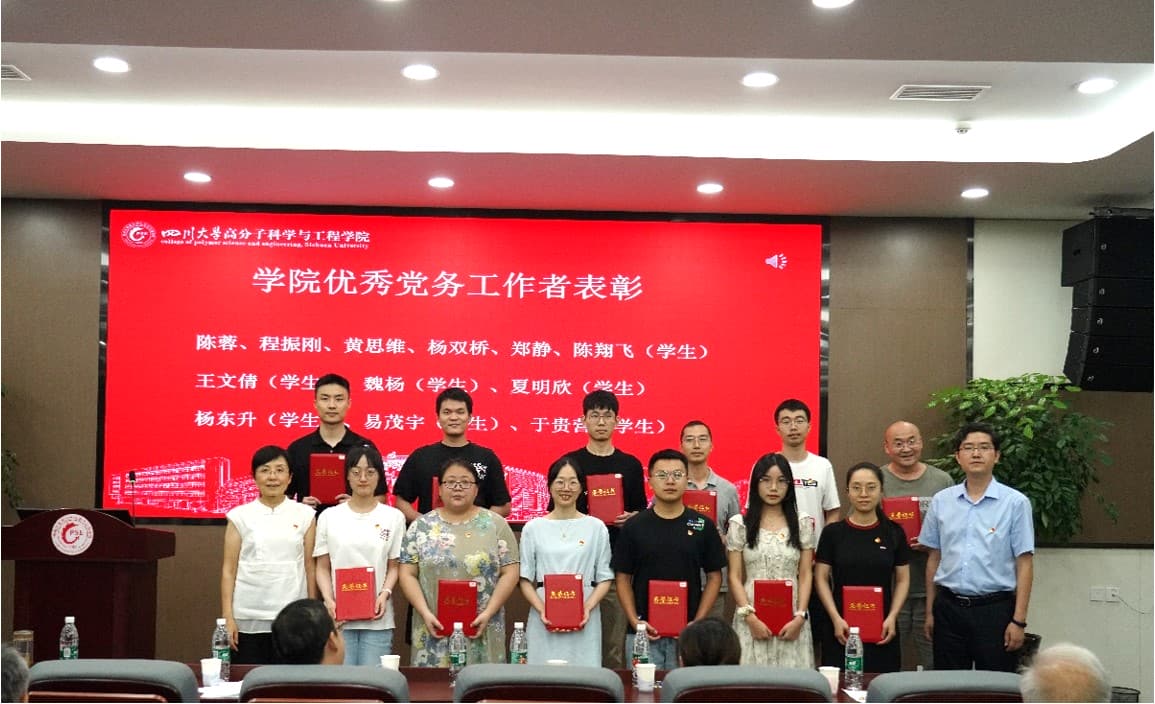 学院党委副书记钱祉祺同志宣读《表彰决定》。学院党委书记牟德富、院长赵长生向丁明双等22名“优秀共产党员”颁发获奖证书;学院党委副书记钱祉祺、副院长冉蓉为陈蓉等12名“优秀党务工作者”颁发获奖证书;学院党委书记牟德富、党委副书记吴宏为高分子材料系党支部等4个“先进党支部”的代表颁发获奖证书。