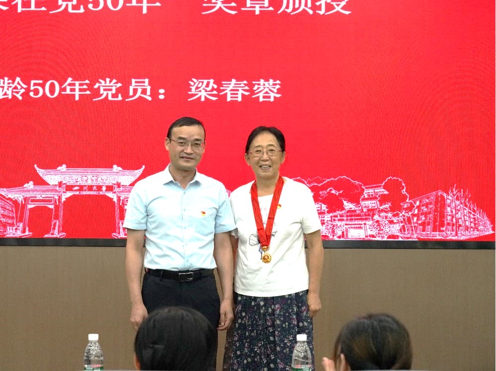大会在庄严的国歌声中拉开序幕。本次大会特别邀请了“光荣在党50年”老党员,牟德富为梁春蓉老党员颁发纪念奖章。