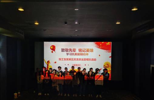 在中国人民志愿军抗美援朝出国作战70周年之际,为深入理解习近平总书记重要讲话精神,加强党员干部爱国主义教育,传承和弘扬伟大抗美援朝精神,11月15日,加工生医第五党支部组织全体党员集体走进影院,开展主题观影活动:缅怀先烈,铭记历史,追忆抗美援朝,致敬最可爱的人。