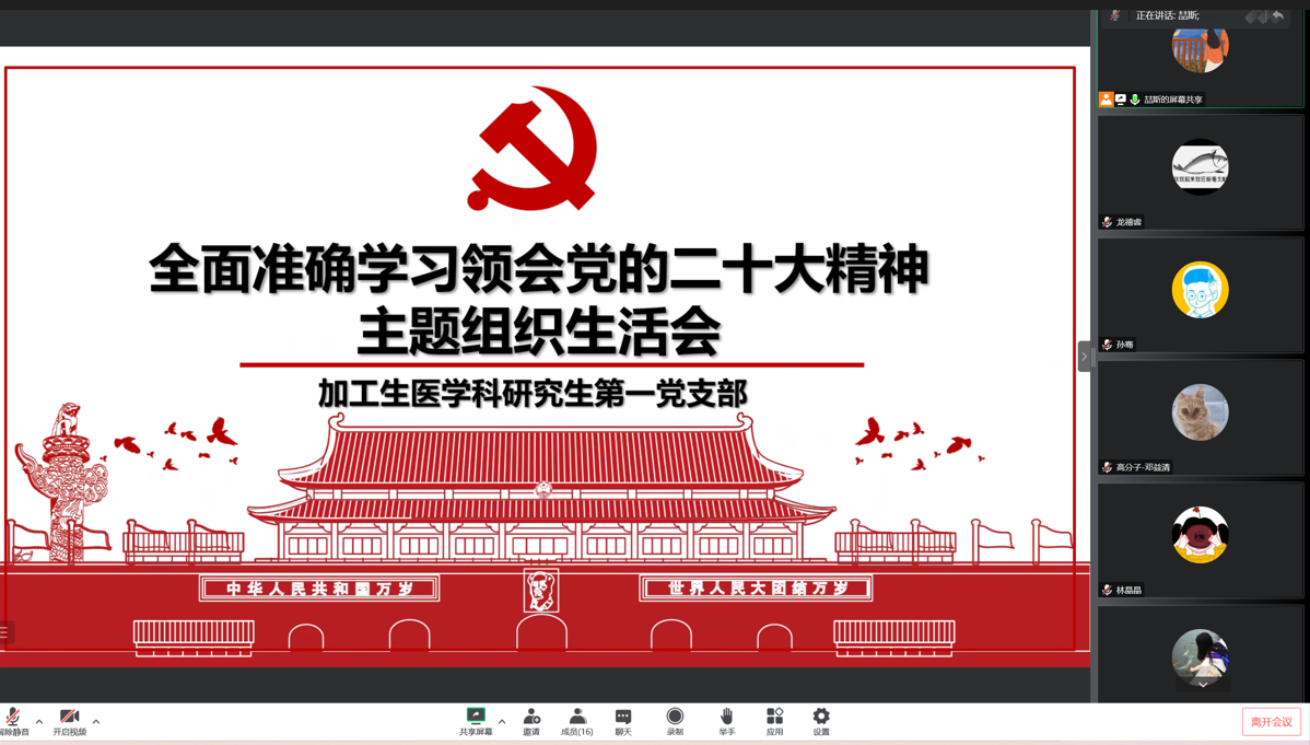 为进一步加强支部思想政治建设工作,全面准确领悟学习党的二十大精神,提高党员思想觉悟,11月18日,成人漫画 加工生医学科研究生第一党支部围绕“高举中国特色社会主义伟大旗帜为全面建设社会主义现代化国家而团结奋斗”的活动主题,在线上腾讯会议举行“全面准确学习领会党的二十大精神”主题组织生活会。加工生医研究生第一党支部全体党员和预备党员参加。