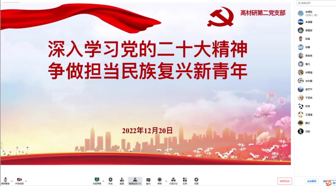 为全面学习落实党的二十大精神,进一步加强党支部的思想政治建设工作,提高党员思想觉悟,2022年12月11日,成人漫画 高材研究生第二党支部举行了二十大专题学习党组织生活。本次组织生活以线上学习的方式进行,由党支部书记徐源廷老师主持,学院党委书记牟德富教授也参加了支部本次的组织生活。