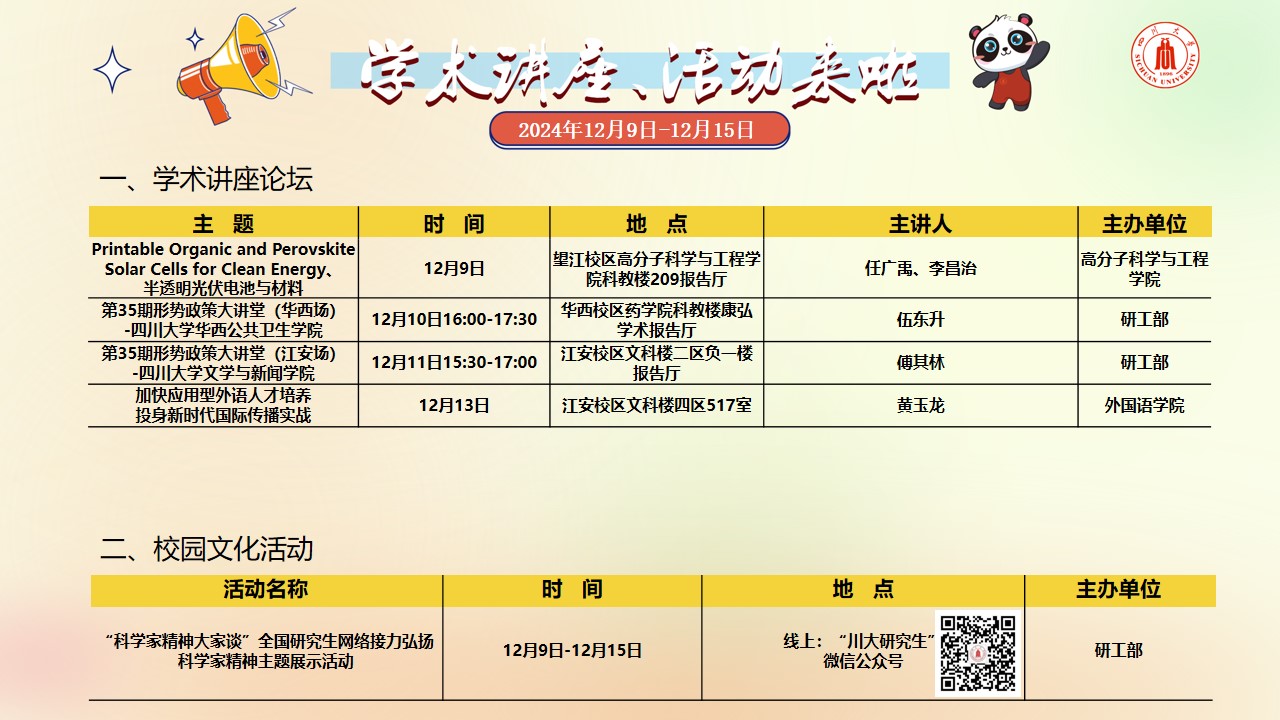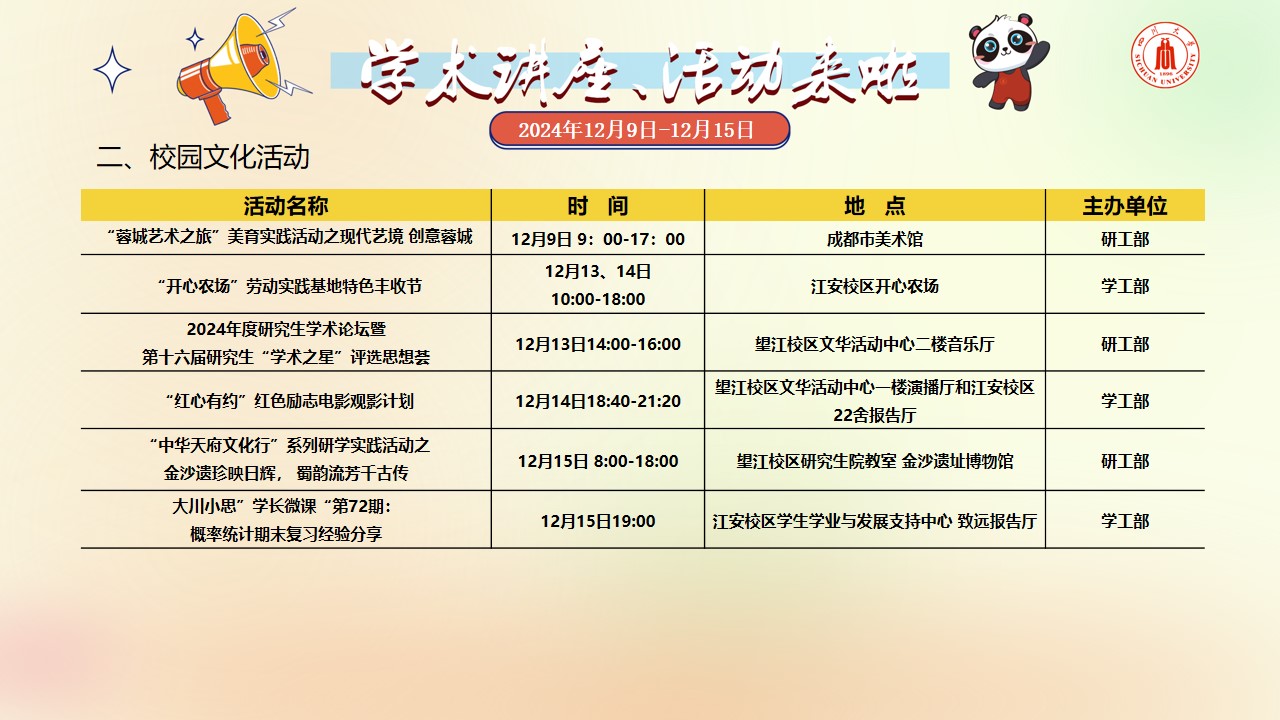 学术讲座及校园文化活动预告(12月9日-12月15日)