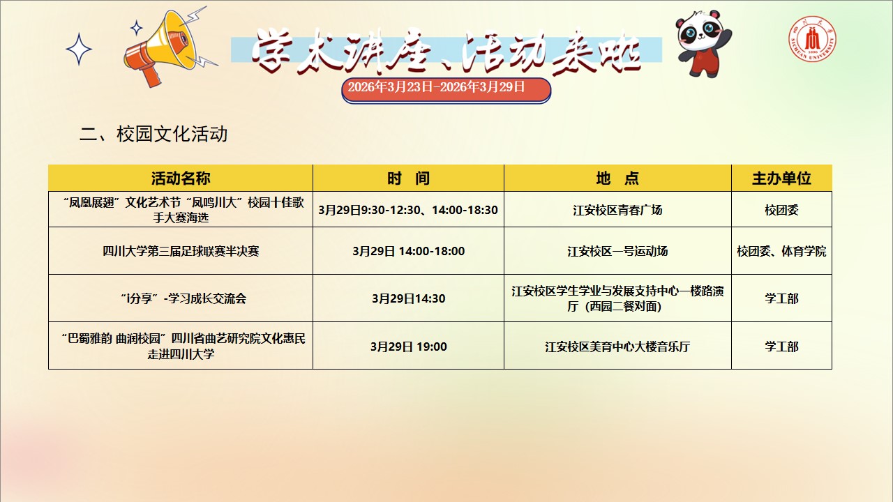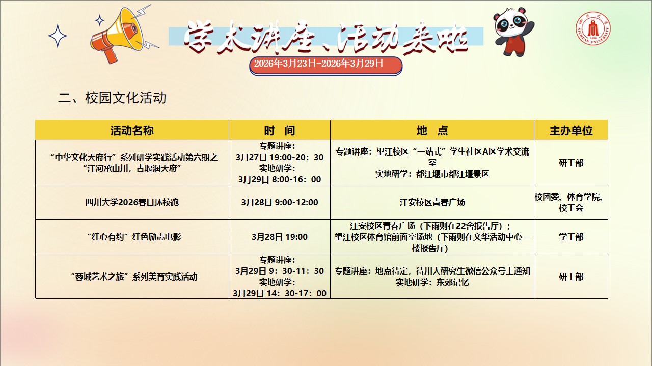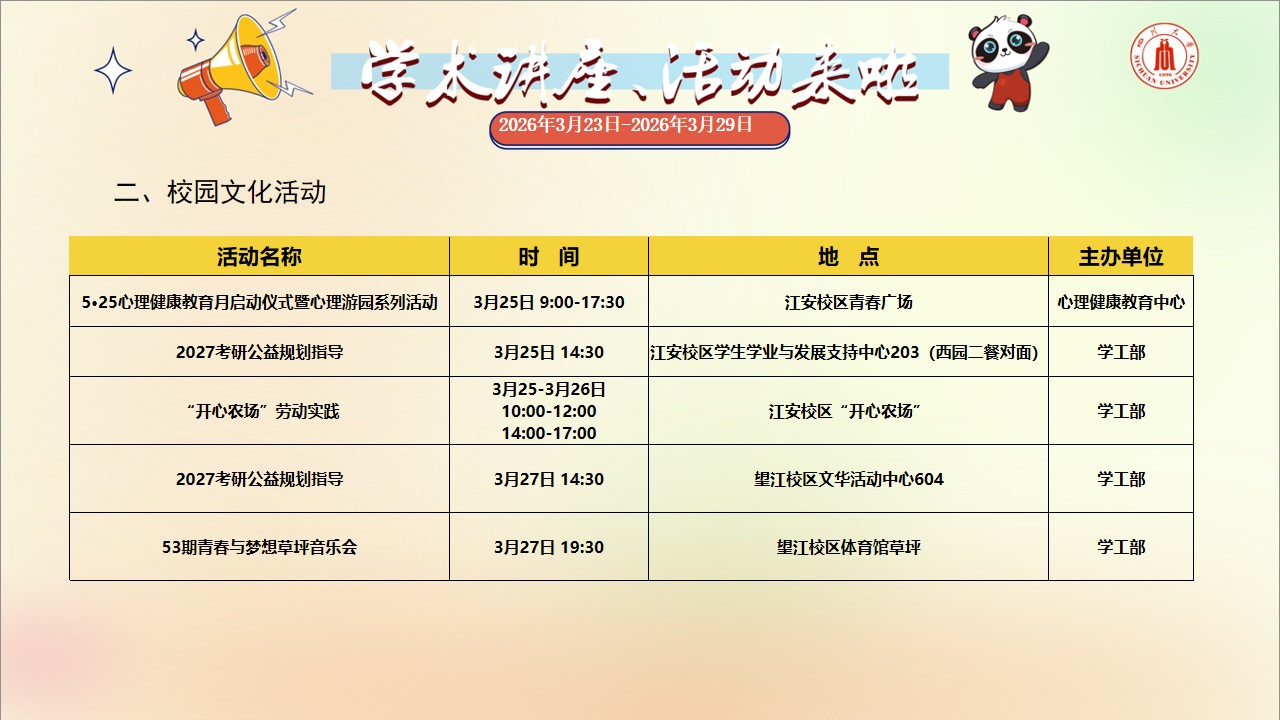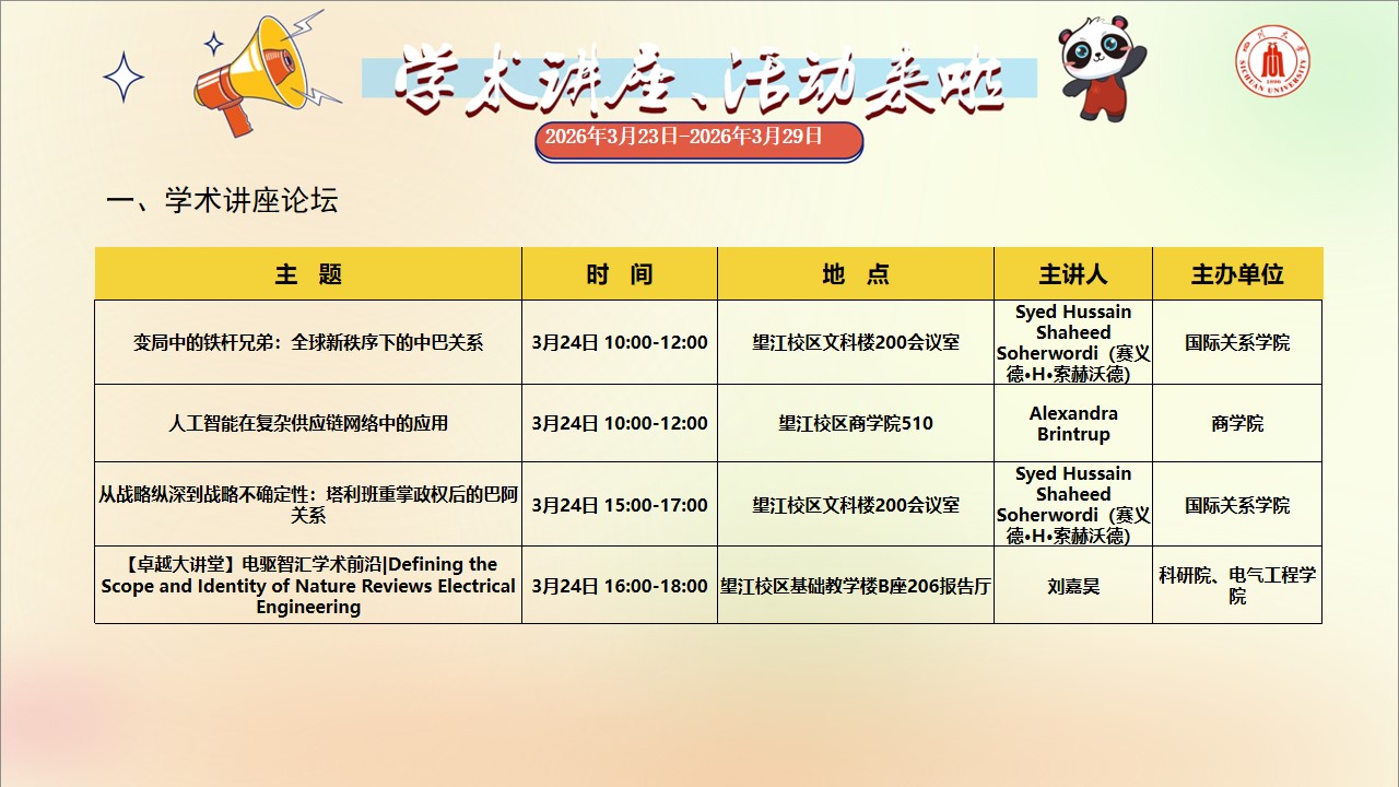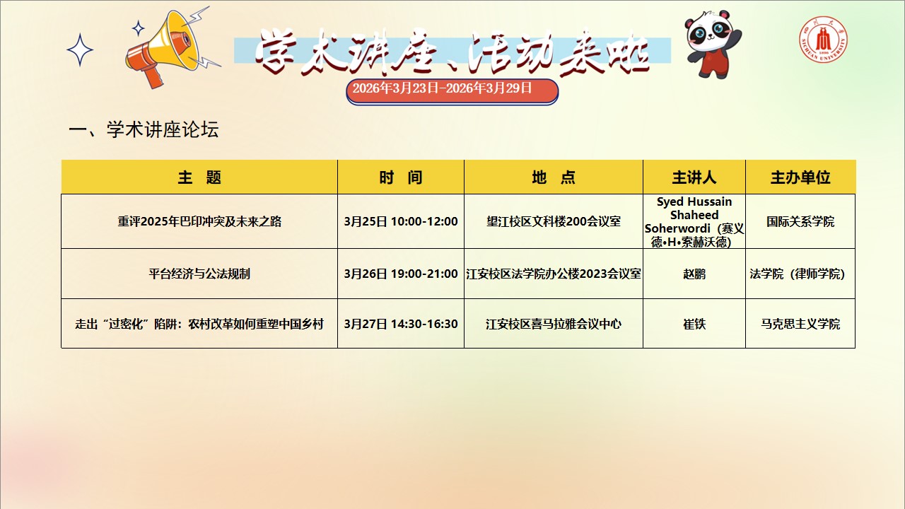 学术讲座与校园文化活动预告(2026年3月23日-2026年3月29日)