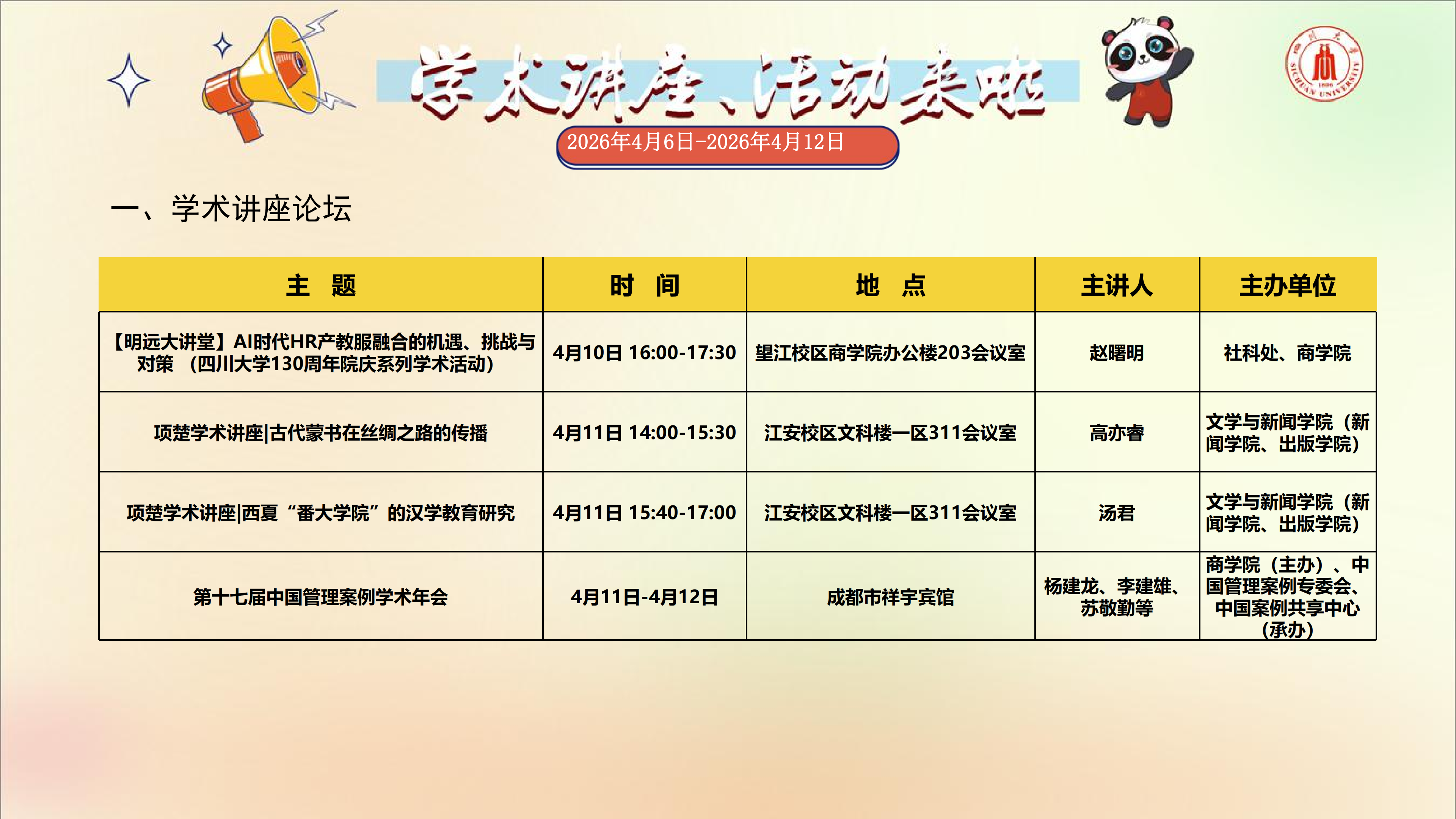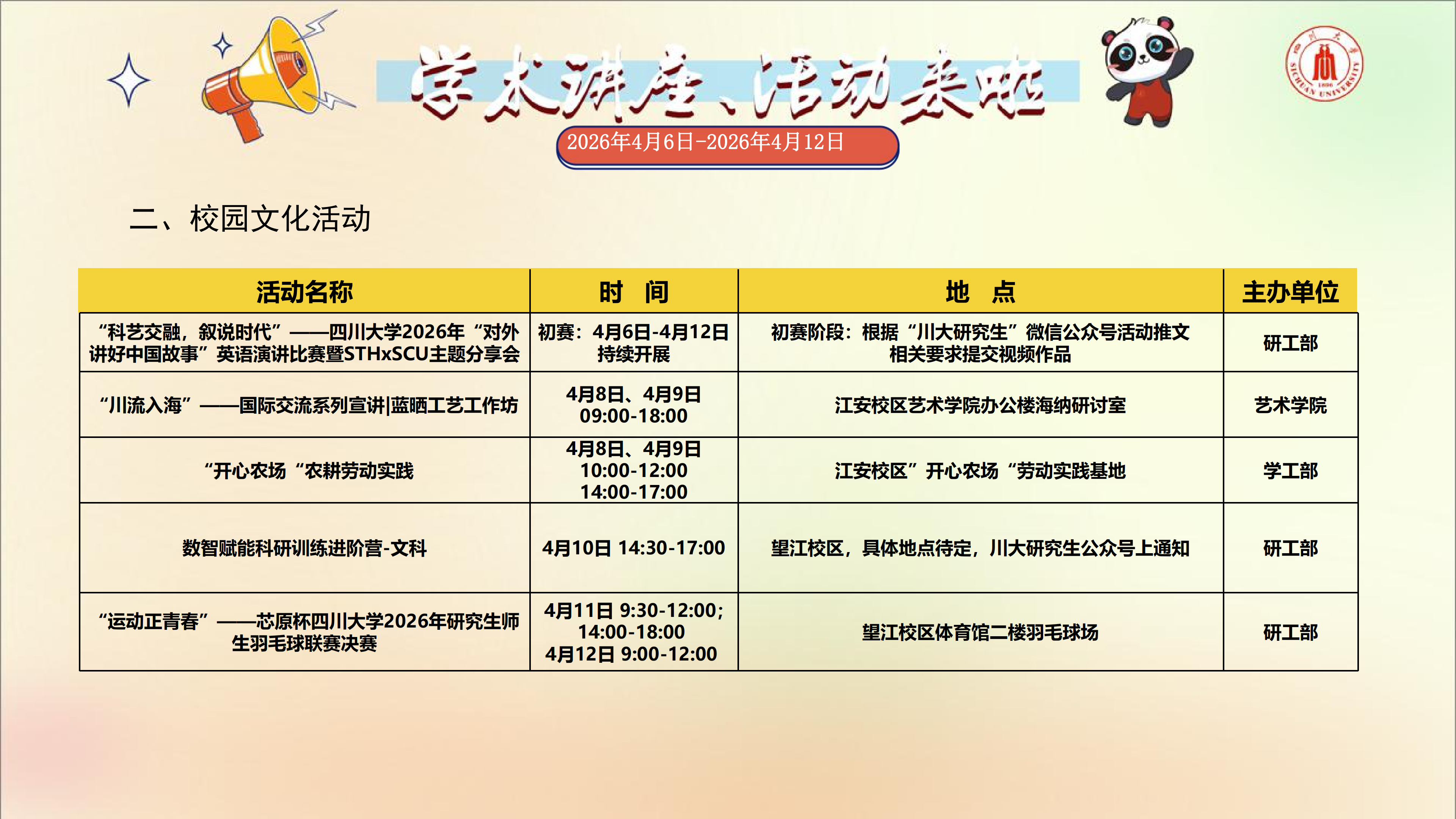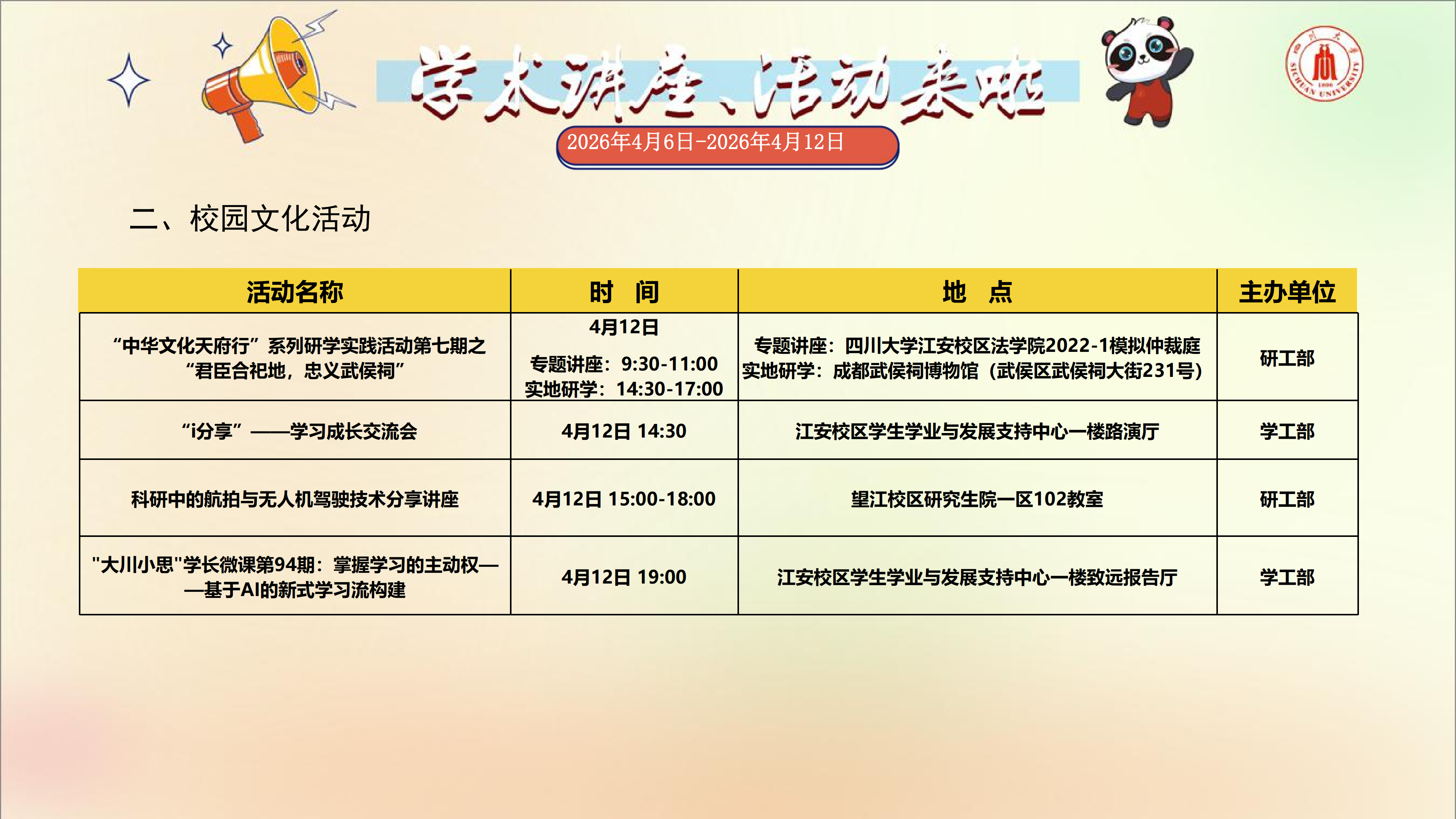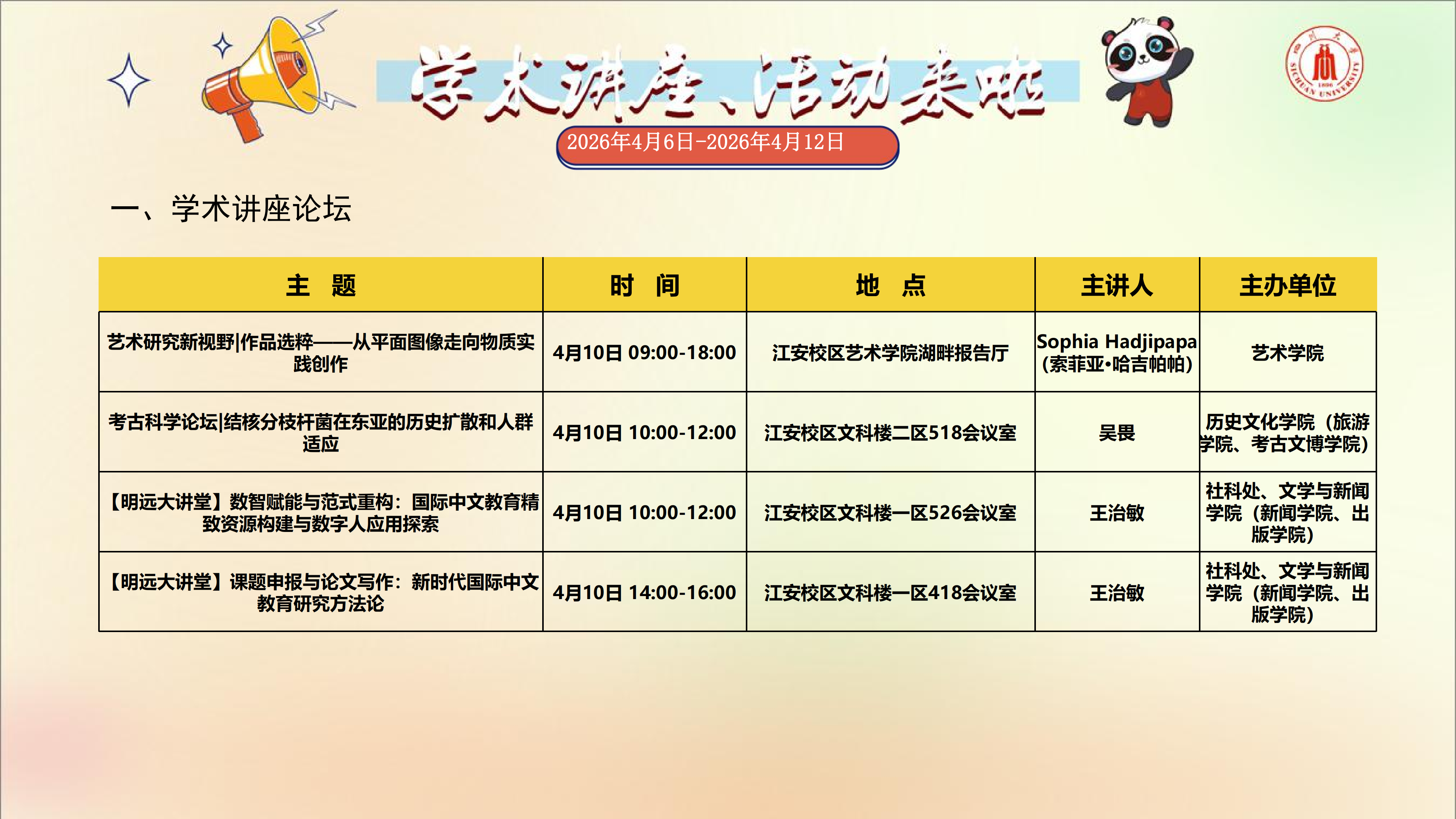 学术讲座与校园文化活动预告(2026年4月6日-2026年4月12日)