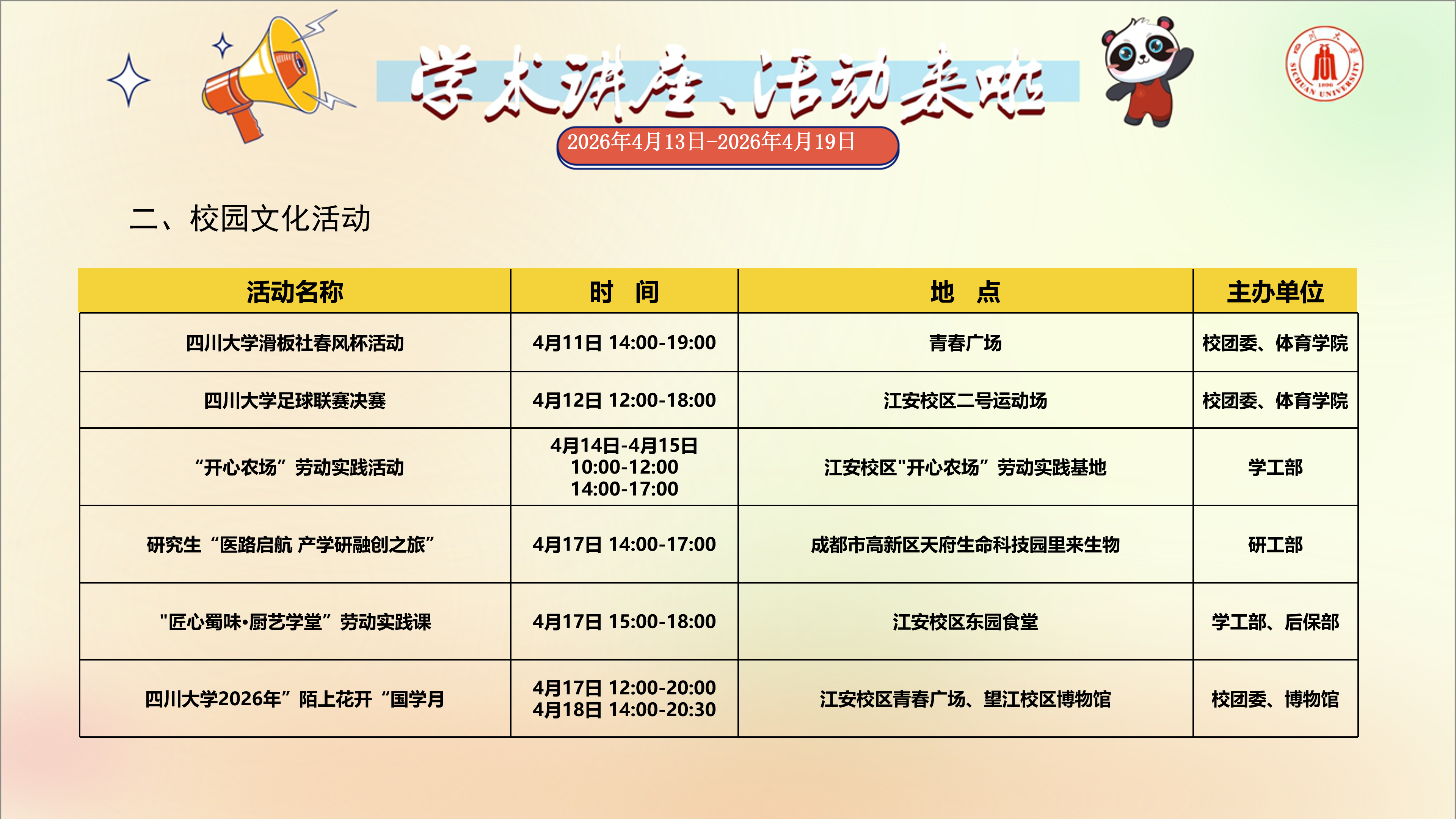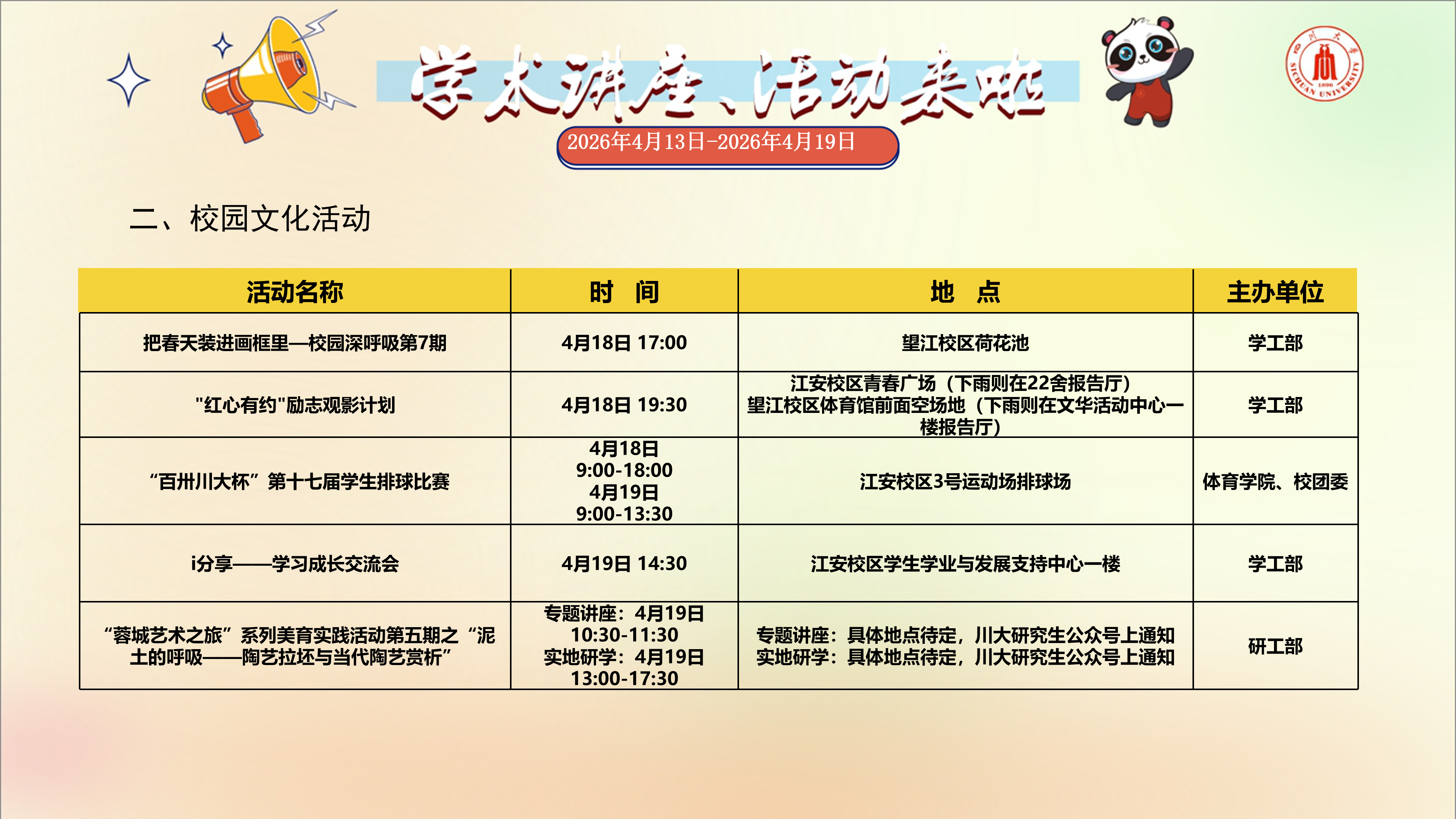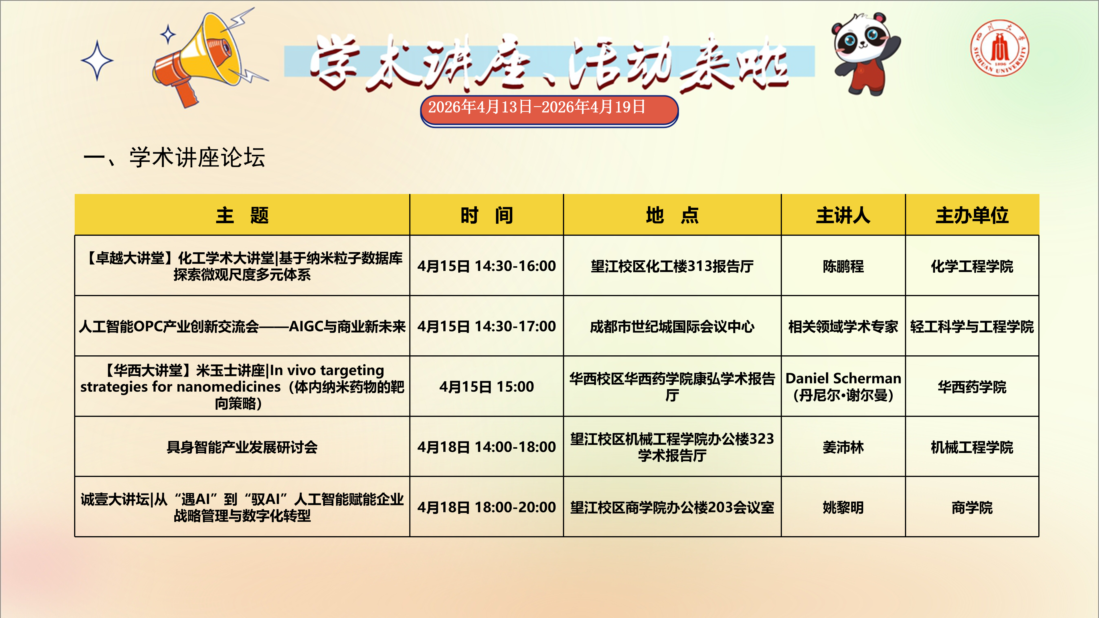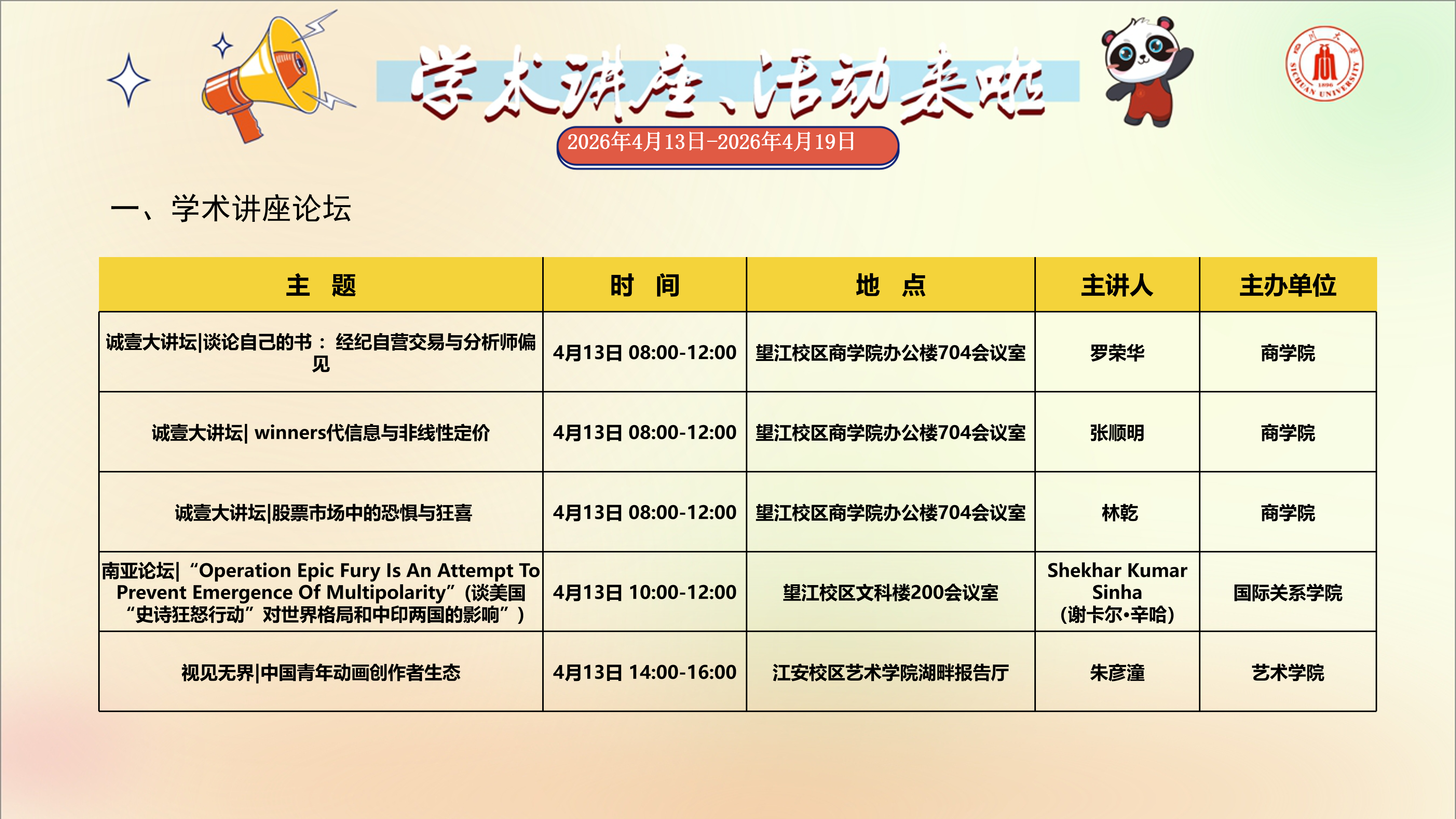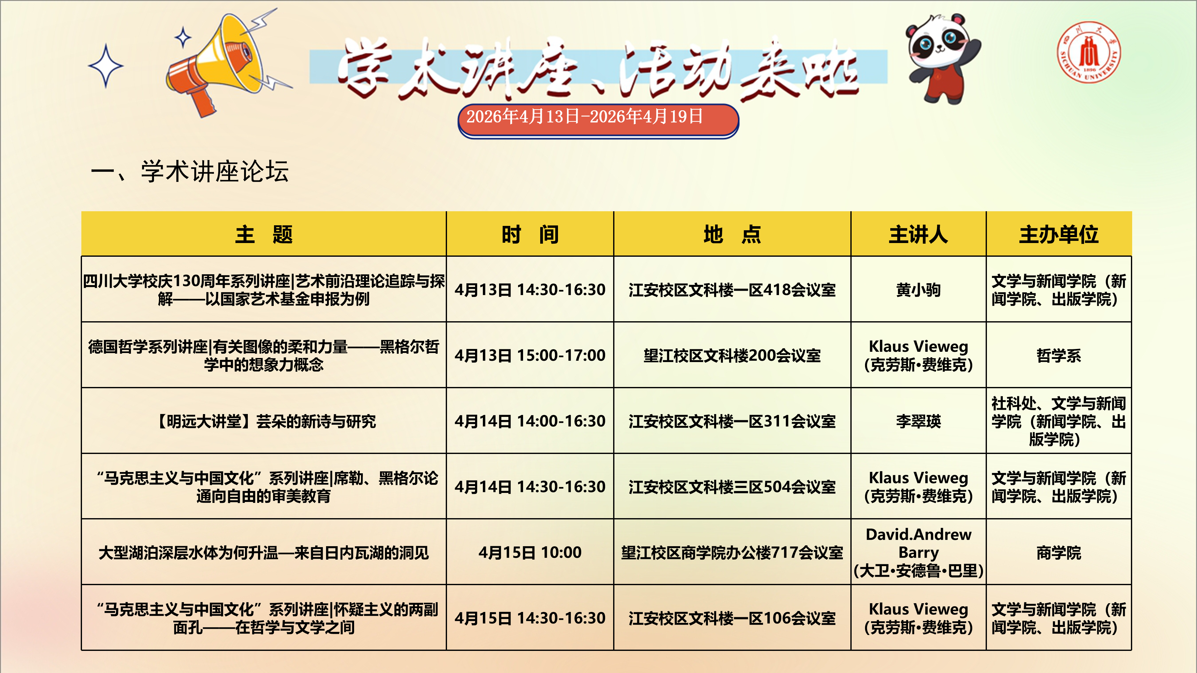 学术讲座与校园文化活动预告(2026年4月13日-2026年4月19日)