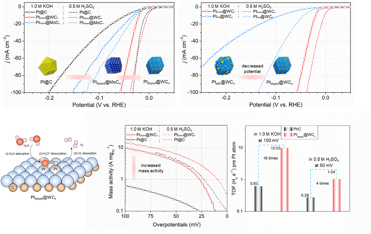 鉴于此研究瓶颈,成人漫画 程冲研究员团队联合南方科技大学王阳刚教授与南京航空航天大学王毅教授等,采用具有类贵金属特性的金属碳化物作为Pt单原子载体,首次实现了金属碳化物晶格限域贵金属单原子的创制,在类铂析氢贵金属单原子催化材料研究领域取得了突破性进展。团队首先设计了一种新型多金属氧簇(PtW6O24和PtMo6O24)-有机杂化配位聚合物前驱体,借助该聚合物前驱体中的Pt-O-W/Mo共价键原位限域/保护Pt原子位点,成功实现了金属碳化物纳米晶体高温生成过程中的规则晶格取代生长。其中,碳化钨晶格限域的Pt单原子表现出类金属铂电极的近0价态与电子结构,从而具有类铂电极的H*吸附行为,导致其电催化性能远远高于金属碳化物载体表面吸附的Pt单原子位点。同时,得益于碳化钨载体的协同作用,Ptdoped@WCx在碱性介质中具有极高的析氢活性,其质量活性(49.5 A mgPt−1,ƞ=150 mV)是20% Pt@C的40倍。相关研究成果以“Crystalline Lattice-Confined Atomic Pt in Metal Carbides to Match Electronic Structures and Hydrogen Evolution Behaviors of Platinum”为题发表在Advanced Materials。该研究工作不仅为创制兼具高单原子载量和类贵金属铂电极的电子结构与催化特性的Pt单原子催化材料提供了开创性的研究思路,也为实现具有高体积催化活性的商用高效析氢单原子催化材料的合成提供了一条全新路径。