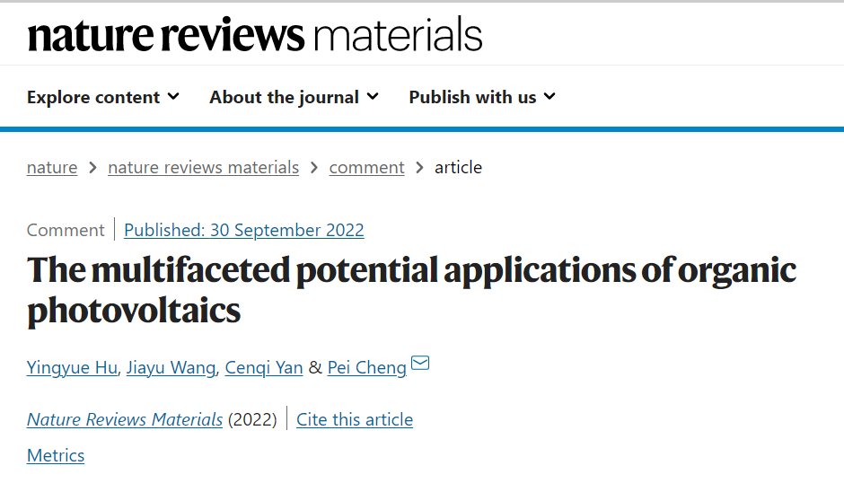 近日,成人漫画 程沛研究员团队受邀在Nature Reviews Materials(影响因子76.7)期刊上发表了题为“The multifaceted potential applications of organic photovoltaics”的前瞻性评述论文(Nat. Rev. Mater., 2022, DOI: 10.1038/s41578-022-00497-y)。该文从有机材料的分子结构与聚集态特性出发,系统论述了有机太阳能电池区别于传统无机太阳能电池的特点及优势——质量轻、半透明、厚度薄、柔性。其中,有机半导体材料具有较大的π共轭和较强的分子内电荷转移,可以实现高的消光系数与“薄”的特性;其主要元素是碳,且分子排列较为松散,从而具备“轻”的特性;有机半导体往往呈现无定形或半结晶状态,因此表现出“柔”的特性;有机半导体的吸收机制是分子轨道之间的电子跃迁,从而实现了“透”的特性。其中,“轻”和“透”的优势使其可应用于温室大棚和建筑物玻璃,以打造零能耗农业与节能建筑。而“薄”、“轻”、“柔”的特性使其可以与智能织物以及生物信息传感器完美兼容,为它们持续供能。此外,有机太阳能电池还可与其他类型的能源器件整合,实现能量的高效转换与利用。最后,该文总结了近年来在上述方面的研究进展,为有机太阳能电池在更多领域下的拓展性应用和产业化提供了新的思路。