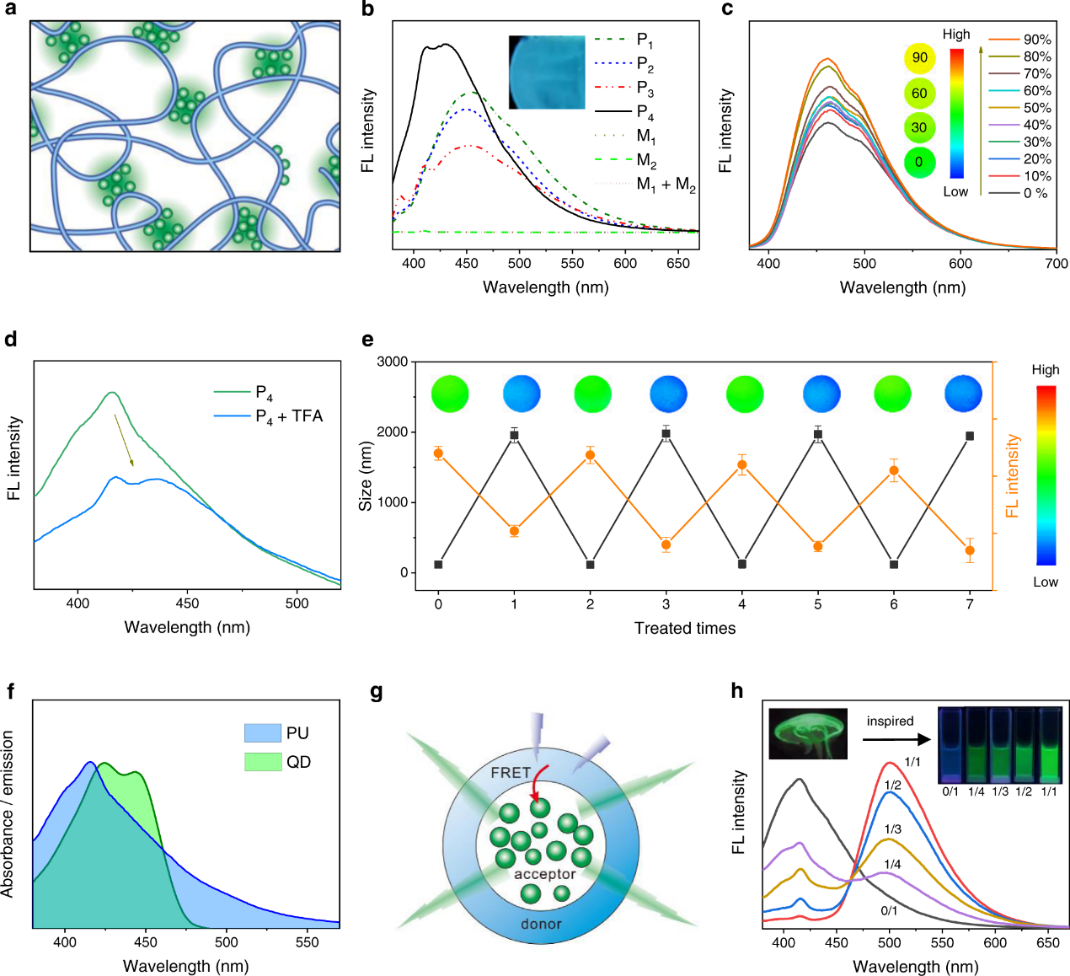 两亲性聚脲基酸酯中大量的羰基和致密的氢键导致羰基部分紧密接近形成“异质簇”,通过荧光光谱表明聚合物具有优异的荧光性能和AIE特性。作者发现荧光对构象具有依赖性。随着无规卷曲到折叠结构的转变,作者观察到荧光蓝移和荧光发射增强,这可能是由于折叠结构的形成增加了分子间氢键和分子链刚性,并抑制了非辐射跃迁。为了证实这一点,作者通过TFA处理自组装体P4,发现聚合物荧光减弱并发生红移,去除TFA后,荧光和粒径又恢复,且可以多次循环。这种构象介导的变形和变色现象与水母在呼吸过程中随着膨胀和收缩表现出的荧光转变行为十分相似。此外,自然界中水母将纯蓝色发光蛋白素的能量转移到绿色荧光蛋白(GFP)并产生绿色荧光。受此启发,作者通过包载喹吖因盐酸盐实现了聚合物从蓝色荧光到绿色荧光的转变(图3),这也是首次报道的基于线型脂肪族高分子的荧光共振能量转移(FRET)现象。