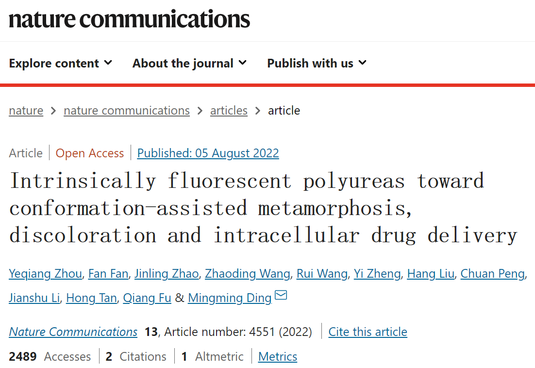 近期,成人漫画 丁明明教授课题组在Nature Communications期刊上发表了题为“Intrinsically fluorescent polyureas toward conformation-assisted metamorphosis, discoloration and intracellular drug delivery”的学术文章,报道了新一代生物响应非经典发光聚脲基酸酯材料及其变形、变色及药物递送性能。在前期工作中,该研究团队发展了利用氧化门控实现聚氨基酸二级结构从β折叠到α螺旋转变的新方法,并通过构象有序转变驱动胶束-囊泡转变和调控聚合物囊泡膜通透性(J. Am. Chem. Soc. 2018, 140, 6604-6610; Angew. Chem. Int. Ed. 2021, 60, 22529–22536)。在此基础上,研究人员以天然氨基酸衍生物为单体,设计合成了一系列不同链段数的两亲性聚脲衍生物,该聚合物的构象对分子量和溶剂具有依赖性,并且具有聚集诱导发射(AIE)特性。此外,聚合物自组装成囊泡和纳米管,表现出氢键介导的尺寸膨胀和收缩、变形和变色行为。同时,该材料还具有超高稳定性和超快响应性,能够实现灵敏的药物释放开关,在药物递送和疾病治疗领域具有潜在的应用前景。