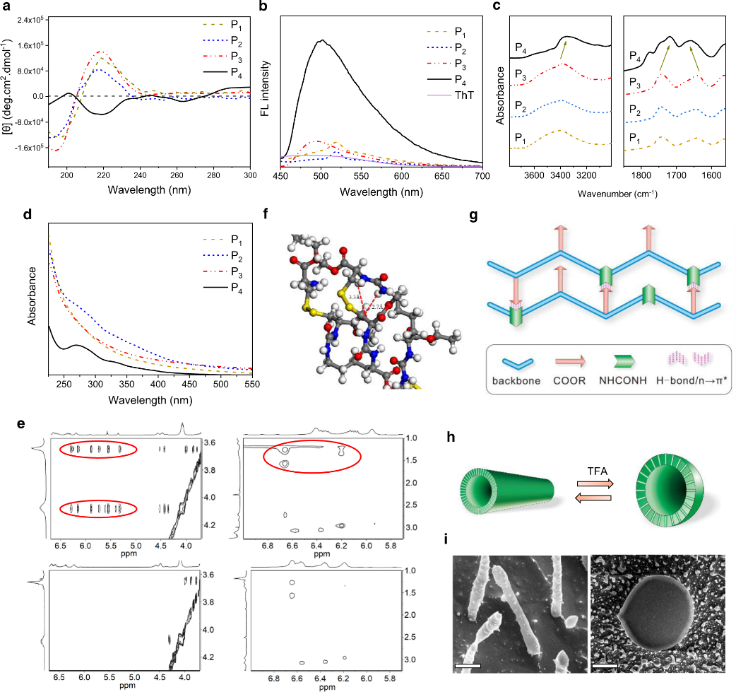 对自组装体进行圆二色谱(CD)、硫磺素T(ThT)等测试,结果表明随着疏水链段数的增加,构象从无规卷曲转变为折叠结构。与此同时,通过红外光谱(FTIR)、紫外吸收光谱(UV)、分子模拟、二维核磁,表明了该有序构象是由侧链酯羰基与脲键之间的氢键和n→π*相互作用形成的。通过溶剂破坏P4的氢键和构象,可以实现形貌由纳米管向囊泡的可逆转变(图2)。