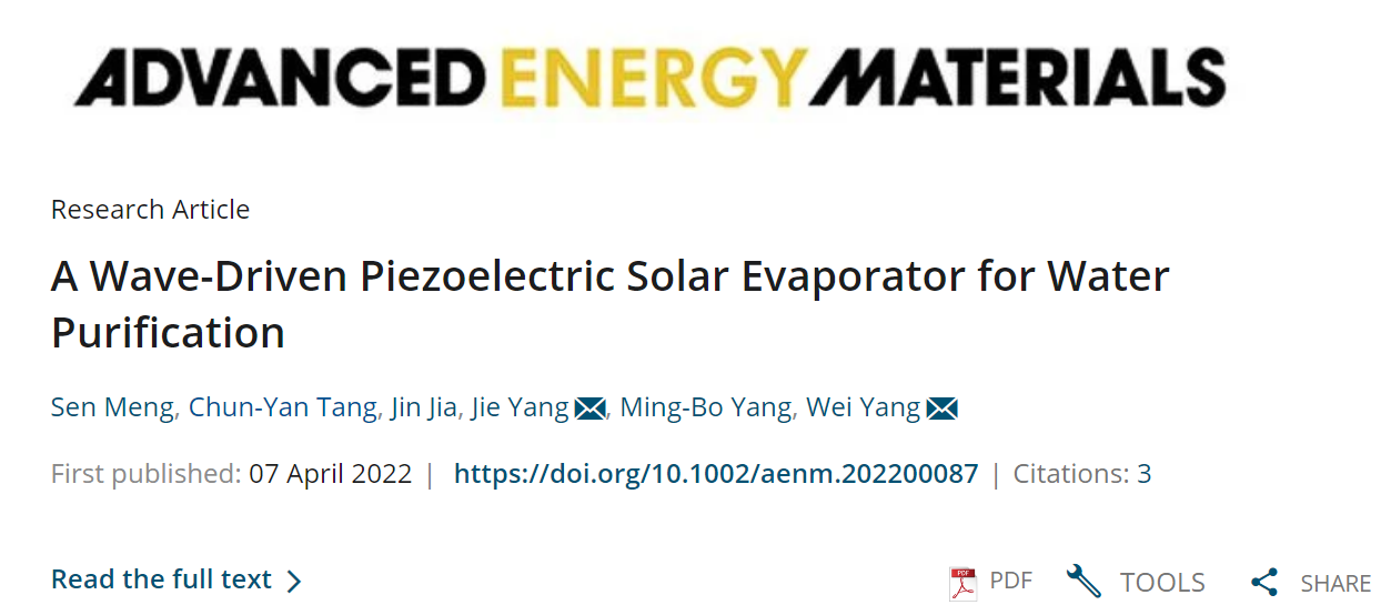 近日,成人漫画 杨伟教授和杨洁副研究员在Advanced Energy Materials (IF=29.69)上发表研究论文:A Wave-Driven Piezoelectric Solar Evaporator for Water Purification,提出了波浪能驱动的水蒸发活化策略,开发了一种自供能、连续化的高效太阳能蒸汽产生装置,实现了波浪能驱动的压电太阳能蒸发器用于水纯化的成果。成人漫画 博士研究生孟森为论文第一作者;杨洁副研究员和杨伟教授为论文通讯作者;成人漫画 为唯一完成单位。