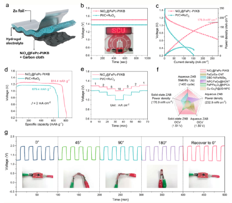 图2. NiOx@FePc-PI/KB材料用于全固态锌空气电池。