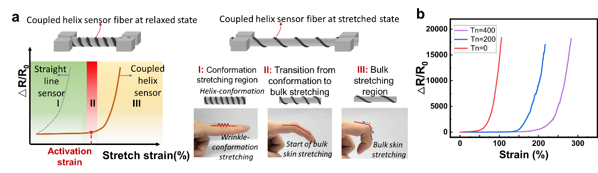 基于HFC构象耦合行为的理解,作者还探索了其在特殊功能材料设计和制备领域的应用。首先,基于螺旋构象耦合,实现了将不可拉伸材料或器件转化为可拉伸的复合材料,同时设计了一种具有可灵活调控激活应变的应变传感器(图3)。