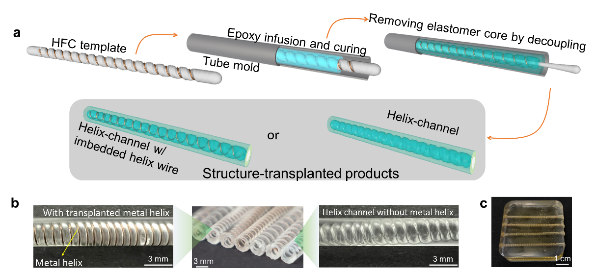 最后,作者还探索了HFC用作弹性模具的可能,以实现复杂结构的复制和移植。其加工原理是基于弹性体芯的构象拉伸变细现象,以及螺旋纤维与高分子基底的机械粘附力作用,实现缠绕纤维构象与弹性体构象解耦合,最终复制和移植所需的螺旋结构(图4)。这将为特殊结构的设计和结构移植智造打开全新思路。