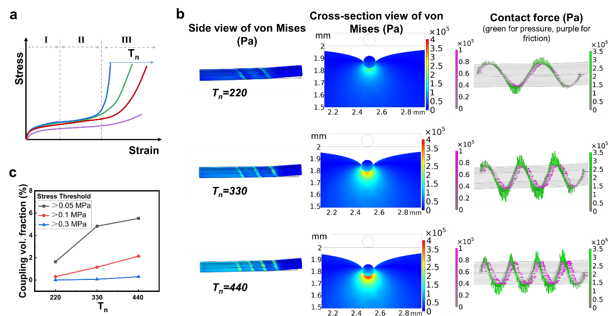 基于上述思考,成人漫画 王宇、傅雪薇、杨伟团队在“驭变幻之象,塑功用之貌”指导思想下,重新思考了缠绕加工背后的科学,并基于缠绕加工提出螺旋构象复合材料(Helix-FiberComposite, HFC)的概念(图1)。这种HFC本质是由宏观尺度的螺旋构象和微观尺度的分子链构象机械耦合而成。这种HFC可通过精准调控螺旋数和机械耦合强度从而调控其力学性能,并发现了其特殊的假弹性行为(Pseudo-elasticbehavior)。作者对HFC的构象耦合机理进行了分析,并且进一步通过有限元数学模拟研究了HFC的耦合效应(图2)。