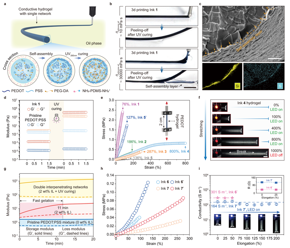 图1.液-液3D打印技术制备PEDOT:PSS导电水凝胶的机理、过程与产品特性示意图