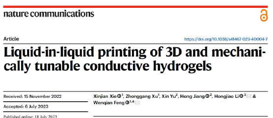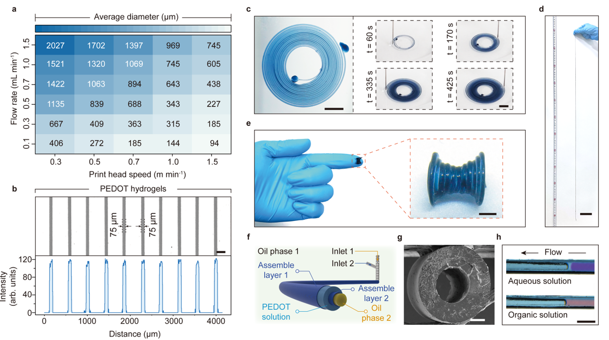 该打印技术可以达到75μm的打印精度,且在1.8cm的直径范围内成功制备出1m长的导电水凝胶,同时能制备不同悬空结构和中空结构的导电水凝胶。