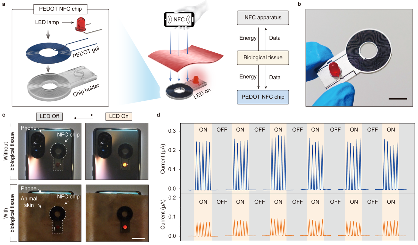 打印出的PEDOT:PSS水凝胶制成的NFC芯片可以实现在有生物皮肤阻隔的条件下,与手机端进行无线信号传输以及电信号的转换,使与之相连的LED灯泡以2 Hz的周期进行闪烁。